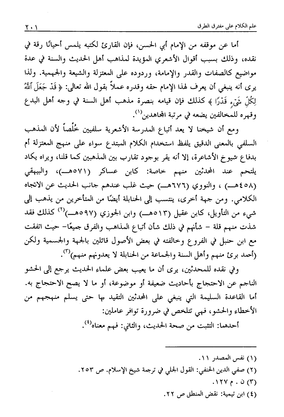ومع أن شيخنا لا يعد أتباع المدرسة الأشعرية سلفيين خلَّصاً لأن المذهب السلفي بالمعنى الدقيق يلفظ استخدام الكلام المبتدع سواء على منهج المعتزلة أم بدفاع شيوخ الأشاعرة، إلا أنه يقر بوجود تقارب بين المذهبين كما قلنا، ويراه يكاد يلتحم عند المحدثين منهم خاصة: كابن عساكر (571 هـ) ، والبيهقي (458 هـ) ، والنووي (676 هـ) حيث غلب عندهم جانب الحديث عن الاتجاه الكلامي. ومن جهة أخرى، ينتسب إلى الحنابلة أيضًا من المتأخرين من يذهب إلى شيء من التأويل، كابن عقيل (513 هـ) وابن الجوزي (597 هـ) (2) كذلك فقد شذت منهم قلة - شأنهم في ذلك شأن أتباع المذاهب والفرق جميعًا - حيث اتفقت مع ابن حنبل في الفروع وخالفته في بعض الأصول قائلين بالجهة والجسمية ولكن (أحمد برئ منهم وأهل السنة والجماعة من الحنابلة لا يعدونهم منهم) (3) .