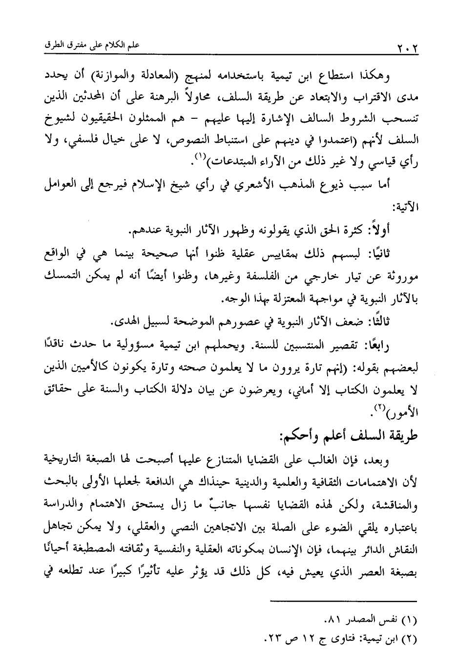 وهكذا استطاع ابن تيمية باستخدامه لمنهج (المعادلة والموازنة) أن يحدد مدى الاقتراب والابتعاد عن طريقة السلف، محاولاً البرهنة على أن المحدثين الذين تنسحب الشروط السالف الإشارة إليها عليهم - هم الممثلون الحقيقيون لشيوخ السلف لأنهم (اعتمدوا في دينهم على استنباط النصوص، لا على خيال فلسفي، ولا رأي قياسي ولا غير ذلك من الآراء المبتدعات) (1) .