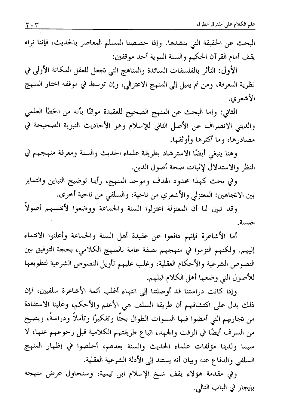 وفي بحث كهذا محدود الهدف وموحد المنهج، رأينا توضيح التباين والتمايز بين الاتجاهين: المعتزلي والأشعري من ناحية، والسلفي من ناحية أخرى.