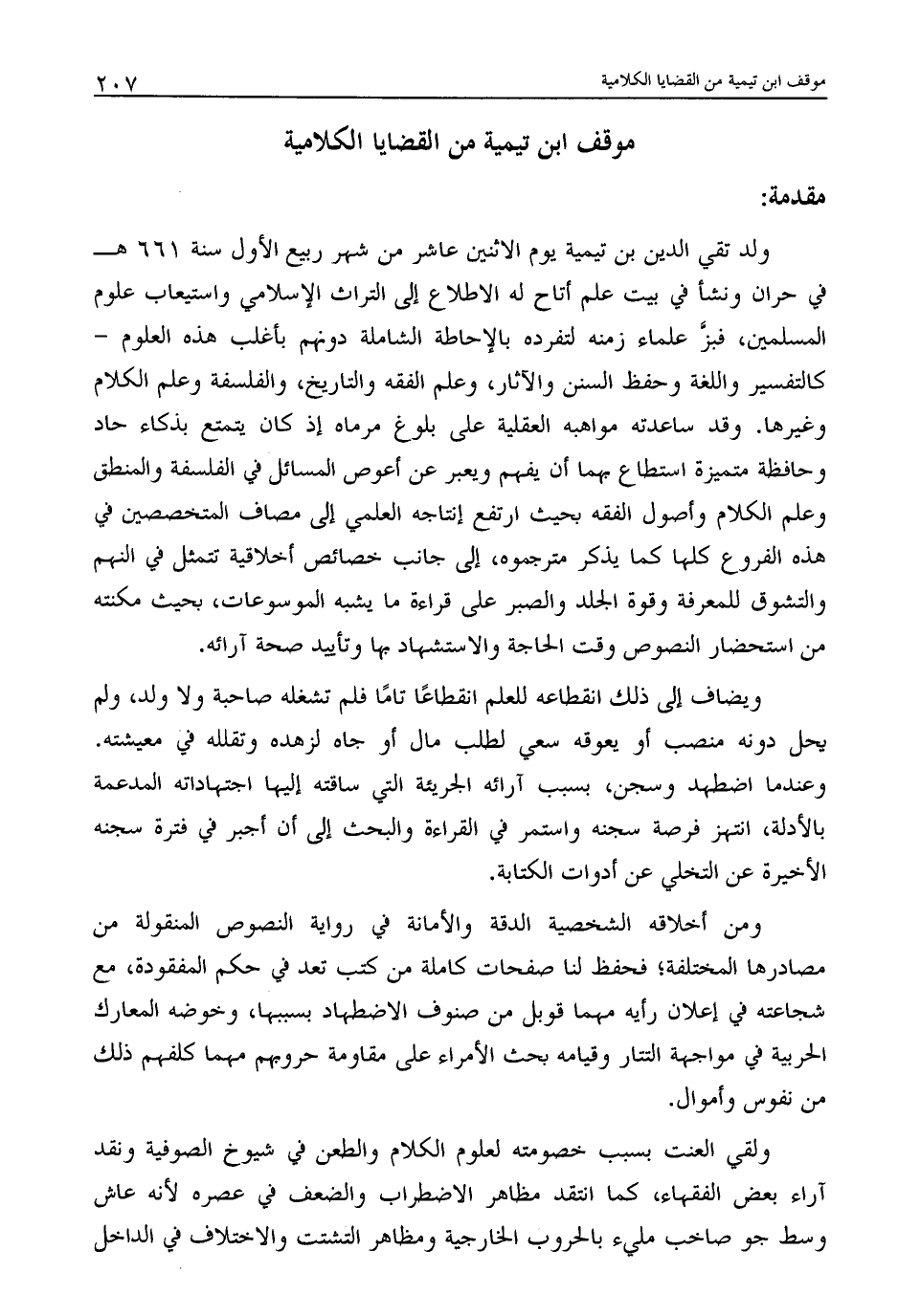 ولد تقي الدين بن تيمية يوم الاثنين عاشر من شهر ربيع الأول سنة 661 هـ في حران ونشأ في بيت علم أتاح له الاطلاع إلى التراث الإسلامي واستيعاب علوم المسلمين، فبزَّ علماء زمنه لتفرده بالإحاطة الشاملة دونهم بأغلب هذه العلوم - كالتفسير واللغة وحفظ السنن والآثار، وعلم الفقه والتاريخ، والفلسفة وعلم الكلام وغيرها. وقد ساعدته مواهبه العقلية على بلوغ مرماه إذ كان يتمتع بذكاء حاد وحافظة متميزة استطاع بهما أن يفهم ويعبر عن أعوص المسائل في الفلسفة والمنطق وعلم الكلام وأصول الفقه بحيث ارتفع إنتاجه العلمي إلى مصاف المتخصصين في هذه الفروع كلها كما يذكر مترجموه، إلى جانب خصائص أخلاقية تتمثل في النهم والتشوق للمعرفة وقوة الجلد والصبر على قراءة ما يشبه الموسوعات، بحيث مكنته من استحضار النصوص وقت الحاجة والاستشهاد بها وتأييد صحة آرائه.