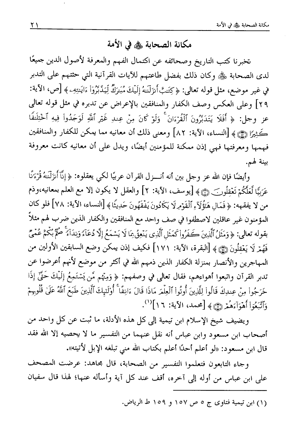 وأيضًا فإن الله عز وجل بين أنه أنزل القرآن عربيًا لكي يعقلوه: (إِنَّا أَنْزَلْنَاهُ قُرْآنًا عَرَبِيًّا لَعَلَّكُمْ تَعْقِلُونَ) [يوسف، الآية: 2] والعقل لا يكون إلا مع العلم بمعانيه، وذم من لا يفقهه: (فَمَالِ هَؤُلَاءِ الْقَوْمِ لَا يَكَادُونَ يَفْقَهُونَ حَدِيثًا) [النساء، الآية: 78] فلو كان المؤمنون غير عاقلين لاصطفوا في صف واحد مع المنافقين والكفار الذين ضرب لهم مثلاً بقوله تعالى: (وَمَثَلُ الَّذِينَ كَفَرُوا كَمَثَلِ الَّذِي يَنْعِقُ بِمَا لَا يَسْمَعُ إِلَّا دُعَاءً وَنِدَاءً صُمٌّ بُكْمٌ عُمْيٌ فَهُمْ لَا يَعْقِلُونَ) [البقرة، الآية: 171] فكيف إذن يمكن وضع السابقين الأولين من المهاجرين والأنصار بمنزلة الكفار الذين ذمهم الله في أكثر من موضع لأنهم أعرضوا عن تدبر القرآن واتبعوا أهواءهم، فقال تعالى في وصفهم: (وَمِنْهُمْ مَنْ يَسْتَمِعُ إِلَيْكَ حَتَّى إِذَا خَرَجُوا مِنْ عِنْدِكَ قَالُوا لِلَّذِينَ أُوتُوا الْعِلْمَ مَاذَا قَالَ آنِفًا أُولَئِكَ الَّذِينَ طَبَعَ اللَّهُ عَلَى قُلُوبِهِمْ وَاتَّبَعُوا أَهْوَاءَهُمْ) [محمد، الآية: 16] (1) .