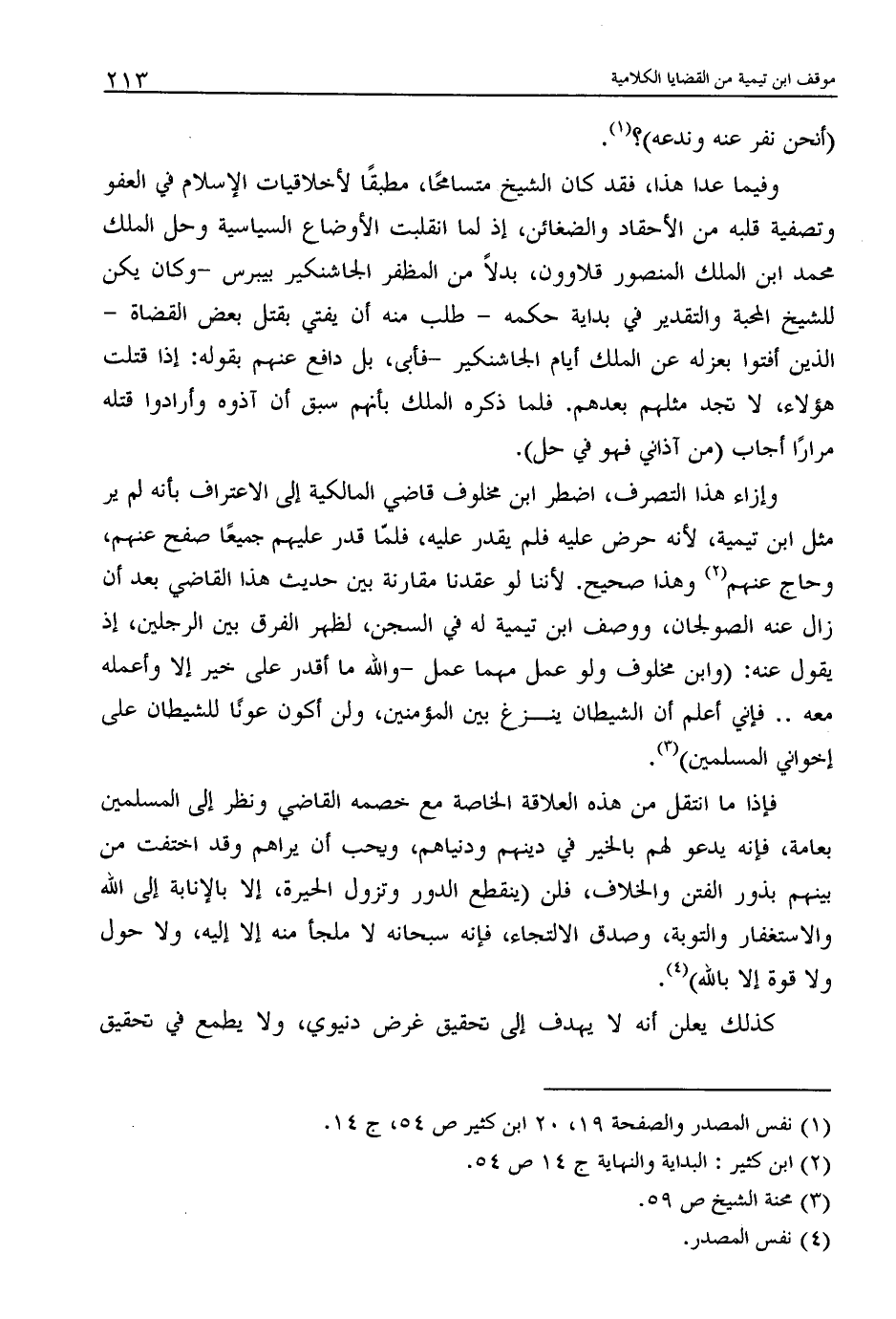 وإزاء هذا التصرف، اضطر ابن مخلوف قاضي المالكية إلى الاعتراف بأنه لم ير مثل ابن تيمية، لأنه حرض عليه فلم يقدر عليه، فلمّا قدر عليهم جميعًا صفح عنهم، وحاج عنهم (2) وهذا صحيح. لأننا لو عقدنا مقارنة بين حديث هذا القاضي بعد أن زال عنه الصولجان، ووصف ابن تيمية له في السجن، لظهر الفرق بين الرجلين، إذ يقول عنه: (وابن مخلوف ولو عمل مهما عمل - والله ما أقدر على خير إلا وأعمله معه.. فإني أعلم أن الشيطان ينزغ بين المؤمنين، ولن أكون عونًا للشيطان على إخواني المسلمين) (3) .