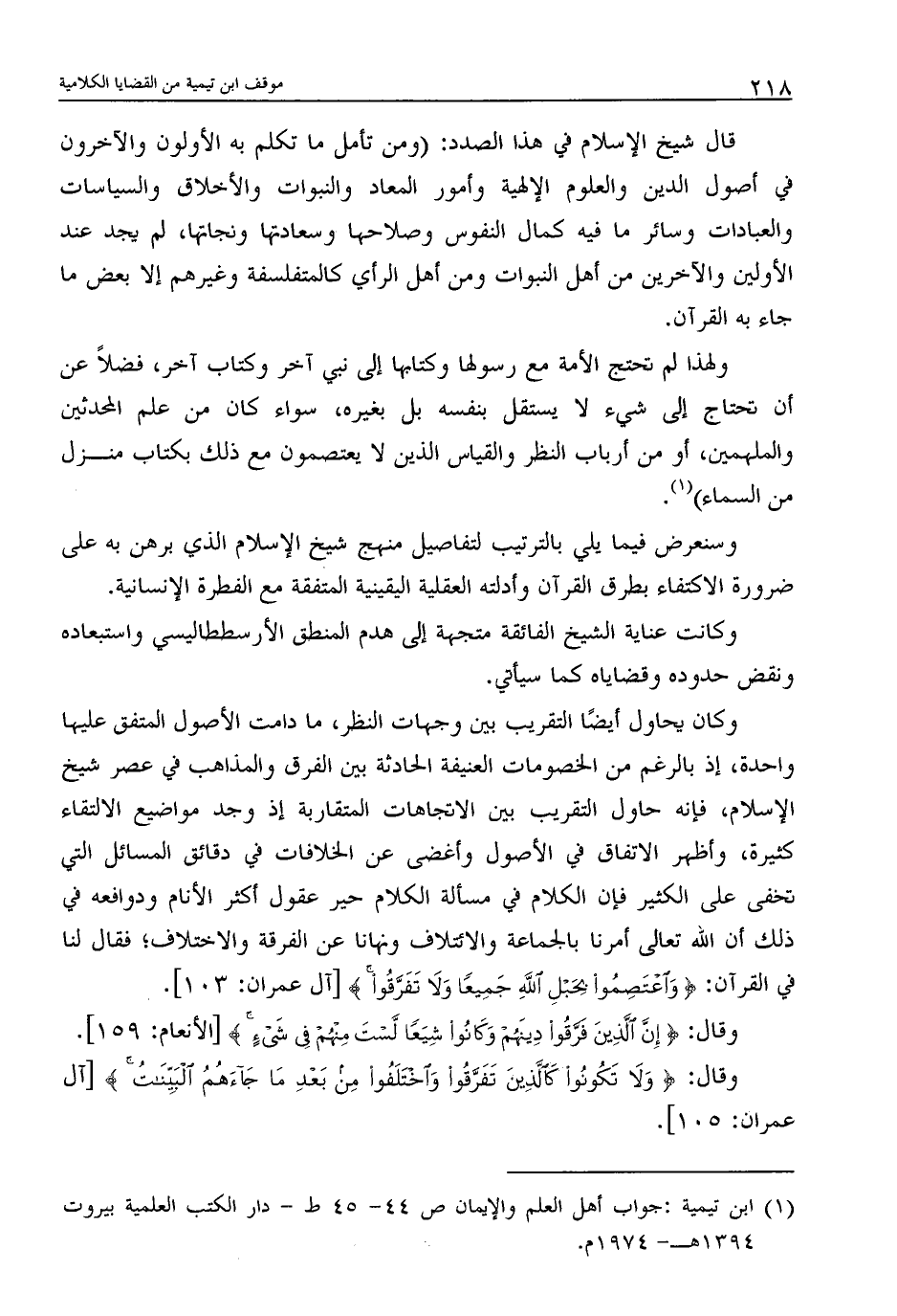 (1) ابن تيمية: جواب أهل العلم والإيمان ص 44 - 45 ط - دار الكتب العلمية بيروت 1394 هـ - 1974 م.