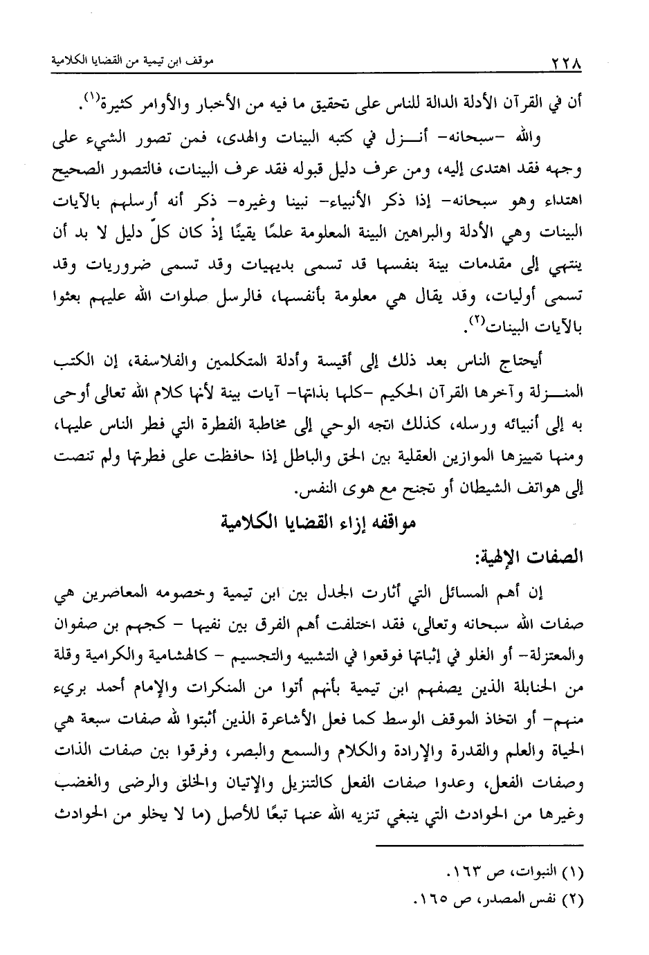 والله - سبحانه - أنزل في كتبه البينات والهدى، فمن تصور الشيء على وجهه فقد اهتدى إليه، ومن عرف دليل قبوله فقد عرف البينات، فالتصور الصحيح اهتداء وهو سبحانه - إذا ذكر الأنبياء - نبينا وغيره - ذكر أنه أرسلهم بالآيات البينات وهي الأدلة والبراهين البينة المعلومة علمًا يقينًا إذْ كان كلّ دليل لا بد أن ينتهي إلى مقدمات بينة بنفسها قد تسمى بديهيات وقد تسمى ضروريات وقد تسمى أوليات، وقد يقال هي معلومة بأنفسها، فالرسل صلوات الله عليهم بعثوا بالآيات البينات (2) .