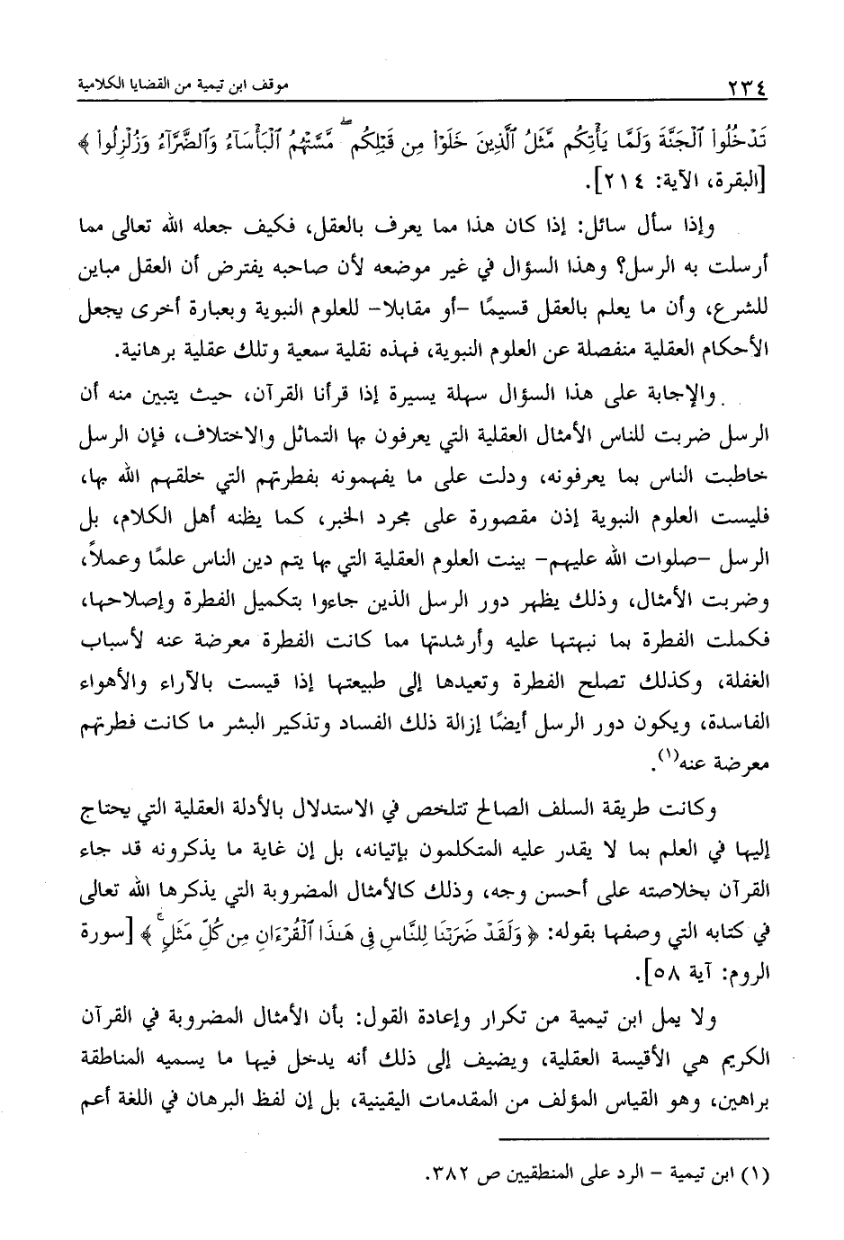 وكانت طريقة السلف الصالح تتلخص في الاستدلال بالأدلة العقلية التي يحتاج إليها في العلم بما لا يقدر عليه المتكلمون بإتيانه، بل إن غاية ما يذكرونه قد جاء القرآن بخلاصته على أحسن وجه، وذلك كالأمثال المضروبة التي يذكرها الله تعالى في كتابه التي وصفها بقوله: (وَلَقَدْ ضَرَبْنَا لِلنَّاسِ فِي هَذَا الْقُرْآنِ مِنْ كُلِّ مَثَلٍ) [سورة الروم: آية 58] .