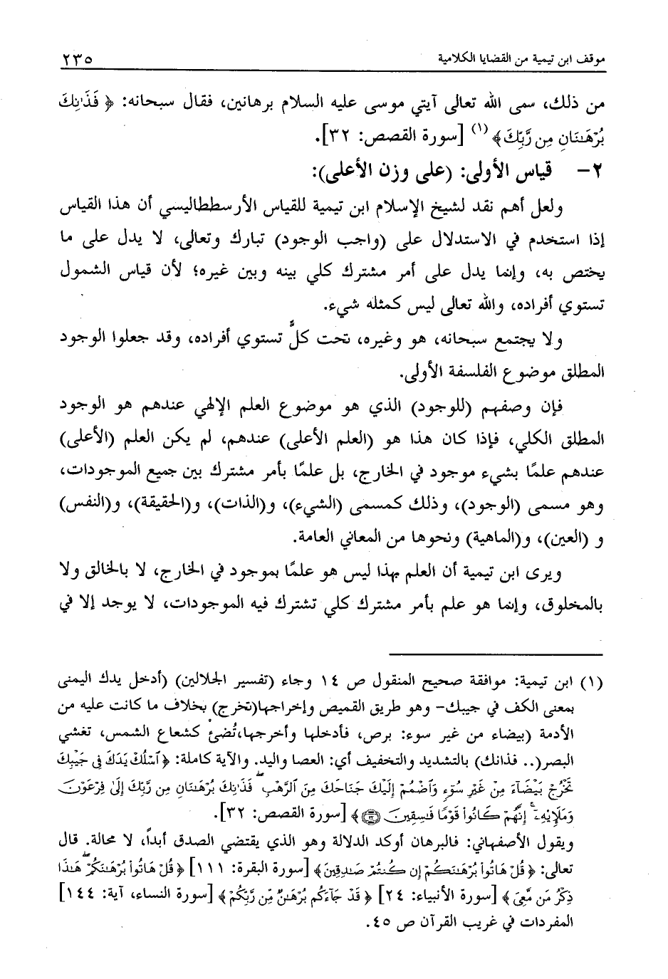 فإن وصفهم (للوجود) الذي هو موضوع العلم الإلهي عندهم هو الوجود المطلق الكلي، فإذا كان هذا هو (العلم الأعلى) عندهم، لم يكن العلم (الأعلى) عندهم علمًا بشيء موجود في الخارج، بل علمًا بأمر مشترك بين جميع الموجودات، وهو مسمى (الوجود) ، وذلك كمسمى (الشيء) ، و (الذات) ، و (الحقيقة) ، و (النفس) و (العين) ، و (الماهية) ونحوها من المعاني العامة.