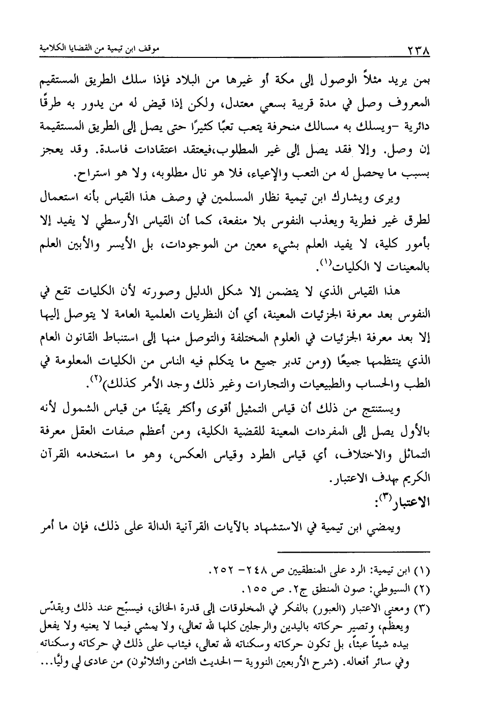 هذا القياس الذي لا يتضمن إلا شكل الدليل وصورته لأن الكليات تقع في النفوس بعد معرفة الجزئيات المعينة، أي أن النظريات العلمية العامة لا يتوصل إليها إلا بعد معرفة الجزئيات في العلوم المختلفة والتوصل منها إلى استنباط القانون العام الذي ينتظمها جميعًا (ومن تدبر جميع ما يتكلم فيه الناس من الكليات المعلومة في الطب والحساب والطبيعيات والتجارات وغير ذلك وجد الأمر كذلك) (2) .