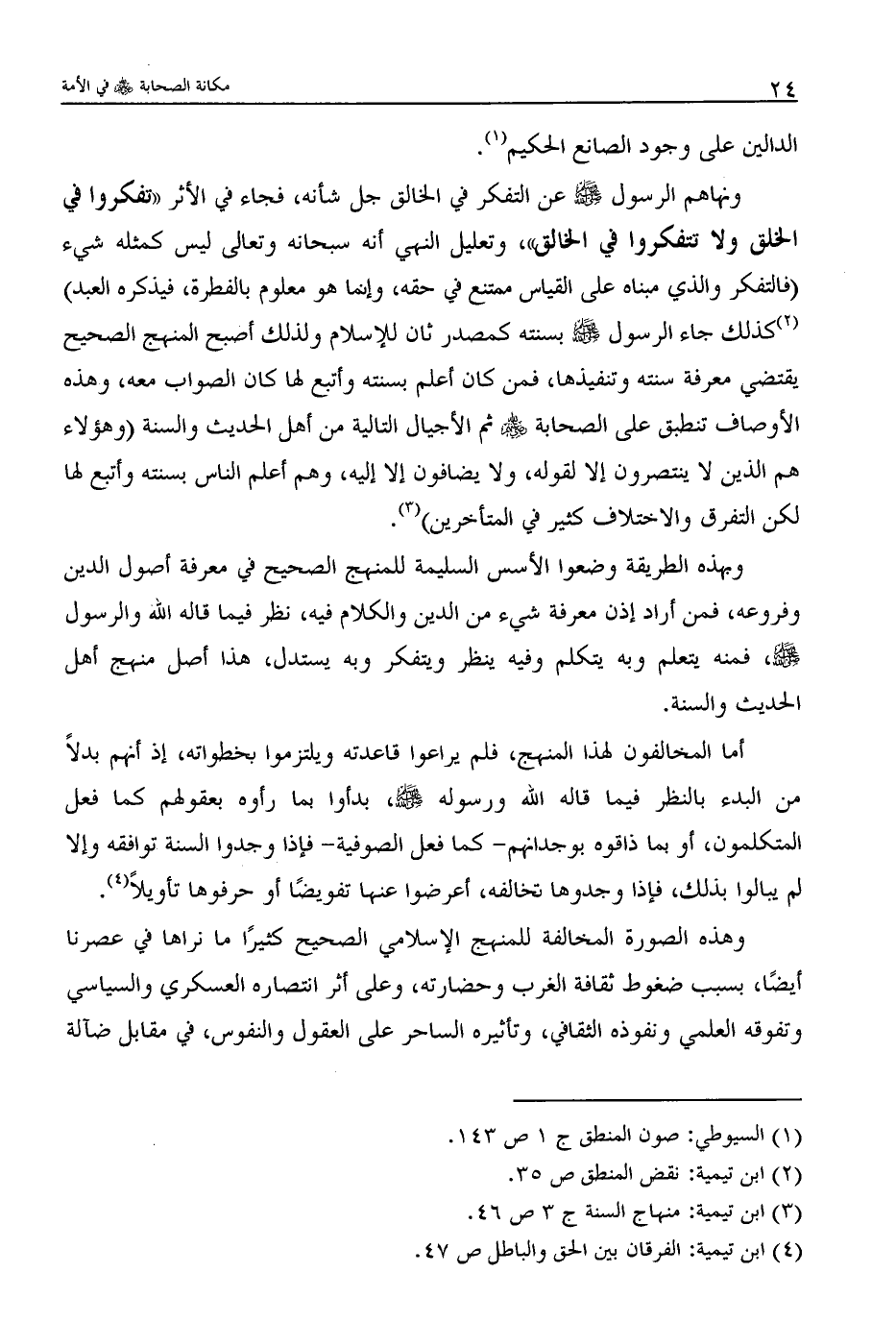 ونهاهم الرسول - صلى الله عليه وسلم - عن التفكر في الخالق جل شأنه، فجاء في الأثر "تفكروا في الخلق ولا تتفكروا في الخالق) ، وتعليل النهي أنه سبحانه وتعالى ليس كمثله شيء (فالتفكر والذي مبناه على القياس ممتنع في حقه، وإنما هو معلوم بالفطرة، فيذكره العبد) (2) كذلك جاء الرسول - صلى الله عليه وسلم - بسنته كمصدر ثان للإسلام ولذلك أصبح المنهج الصحيح يقتضي معرفة سنته وتنفيذها، فمن كان أعلم بسنته وأتبع لها كان الصواب معه، وهذه الأوصاف تنطق على الصحابة - رضي الله عنهم - ثم الأجيال التالية من أهل الحديث والسنة (وهؤلاء هم الذين لا ينتصرون إلا لقوله، ولا يضافون إلا إليه، وهم أعلم الناس بسنته وأتبع لها لكن التفرق والاختلاف كثير في المتأخرين) (3) .
