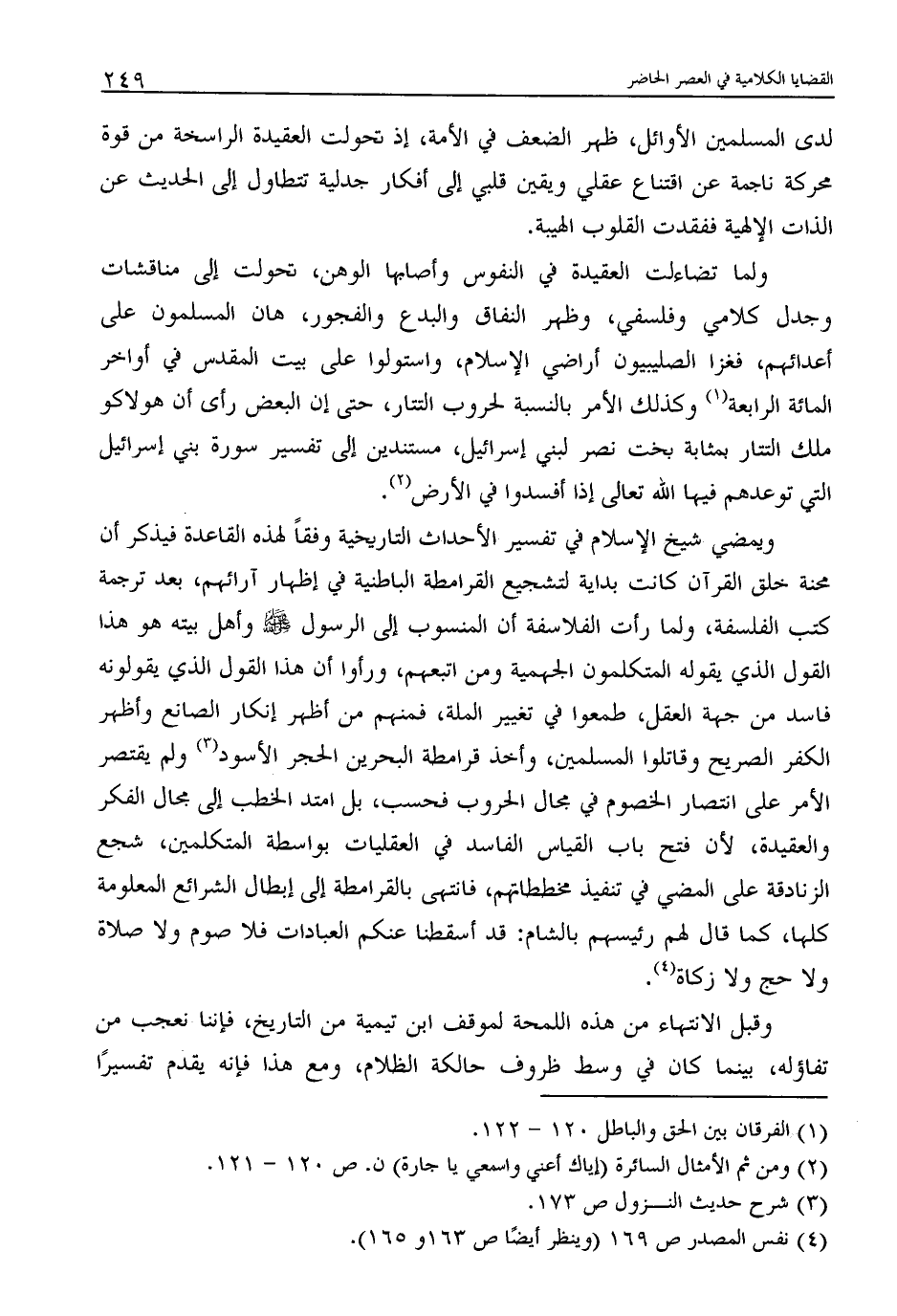ولما تضاءلت العقيدة في النفوس وأصابها الوهن، تحولت إلى مناقشات وجدل كلامي وفلسفي، وظهر النفاق والبدع والفجور، هان المسلمون على أعدائهم، فغزا الصليبيون أراضي الإسلام، واستولوا على بيت المقدس في أواخر المائة الرابعة (1) وكذلك الأمر بالنسبة لحروب التتار، حتى إن البعض رأى أن هولاكو ملك التتار بمثابة بخت نصر لبني إسرائيل، مستندين إلى تفسير سورة بني إسرائيل التي توعدهم فيها الله تعالى إذا أفسدوا في الأرض (2) .