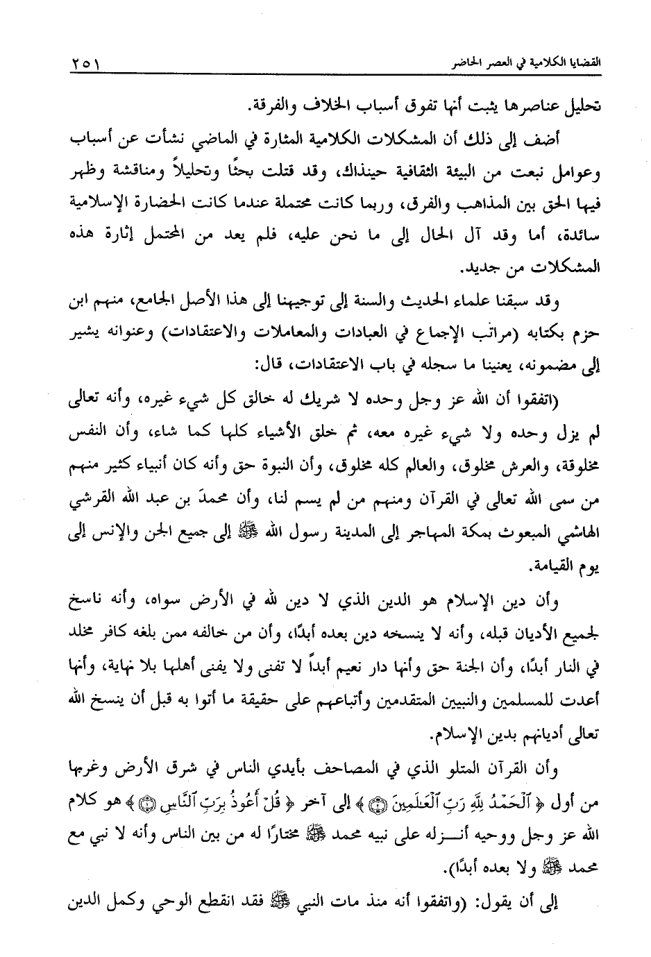 وقد سبقنا علماء الحديث والسنة إلى توجيهنا إلى هذا الأصل الجامع، منهم ابن حزم بكتابه (مراتب الإجماع في العبادات والمعاملات والاعتقادات) وعنوانه يشير إلى مضمونه، يعنينا ما سجله في باب الاعتقادات، قال:
