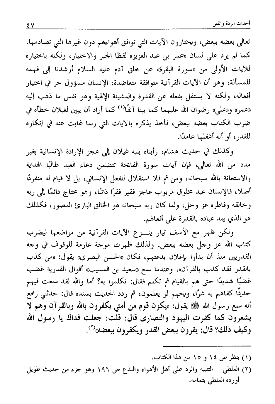 ولكن ظهر مع الأسف تيار ينزع الآيات القرآنية من مواضعها ليضرب كتاب الله عز وجل بعضه ببعض. ولذلك ظهرت موجة عارمة للوقوف في وجه القدريين منذ أن بدأوا بإعلان بدعتهم، فكان "الحسن البصري" يقول: "من كذب بالقدر فقد كذب بالقرآن"، وعندما سمع "سعيد بن المسيب" أقوال القدرية غضب غضبًا شديدًا حتى هم بالقيام ثم تكلم فقال: تكلموا به؟ أما والله لقد سمعت فيهم حديثًا كفاهم به شرًا، ويحهم لو يعلمون، ثم ردد الحديث بسنده قال: حدثني رافع أنه سمع رسول الله - صلى الله عليه وسلم - يقول: "يكون قوم من أمتي يكفرون بالله وبالقرآن وهم لا يشعرون كما كفرت اليهود والنصارى قال: قلت: جعلت فداك يا رسول الله وكيف ذلك؟ قال: يقرون ببعض القدر ويكفرون ببعضه" (2) .