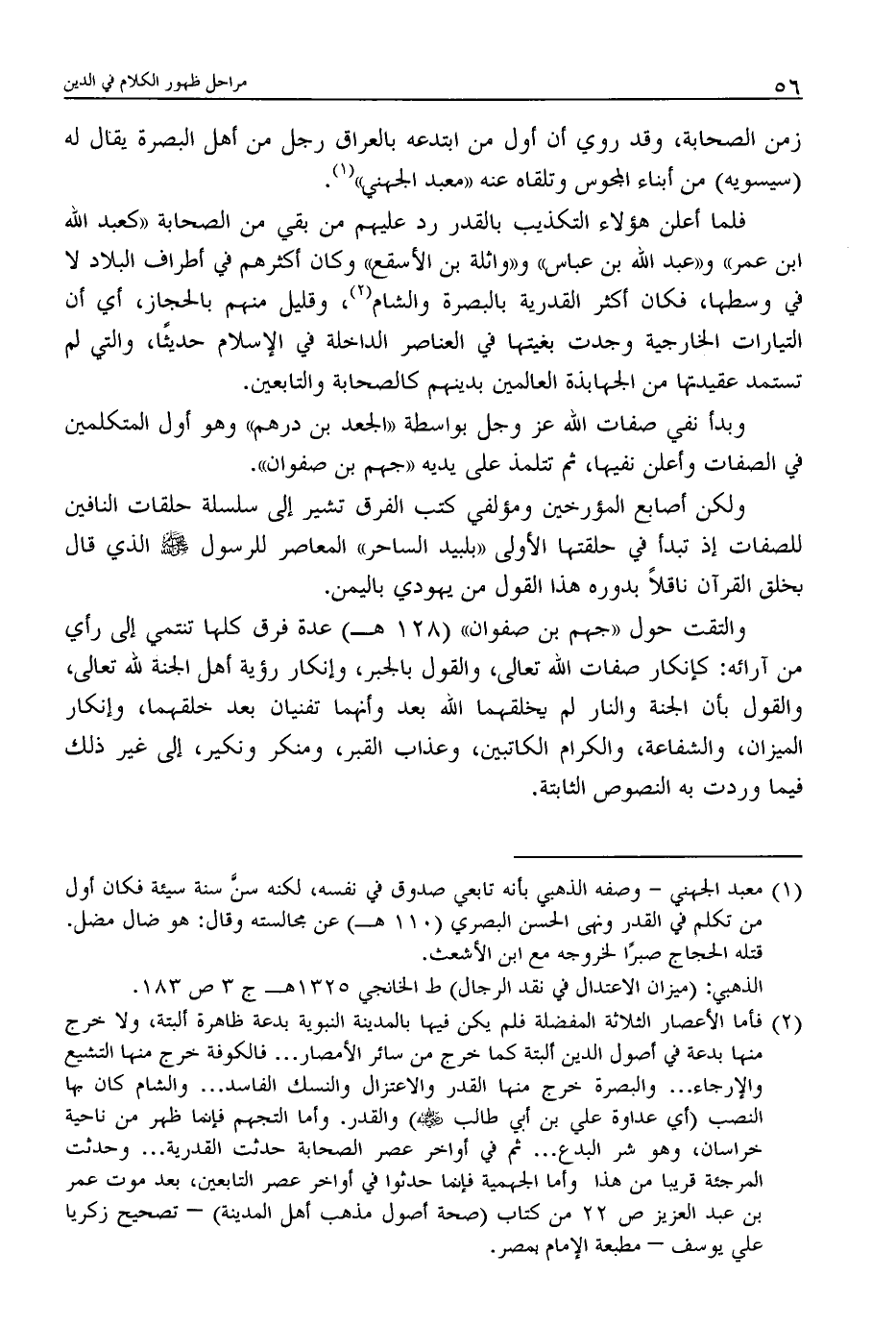 (1) معبد الجهني - وصفه الذهبي بأنه تابعي صدوق في نفسه، لكنه سنَّ سنة سيئة فكان أول من تكلم في القدر ونهى الحسن البصري (110 هـ) عن مجالسته وقال: هو ضال مضل. قتله الحجاج صبراً لخروجه مع ابن الأشعث.