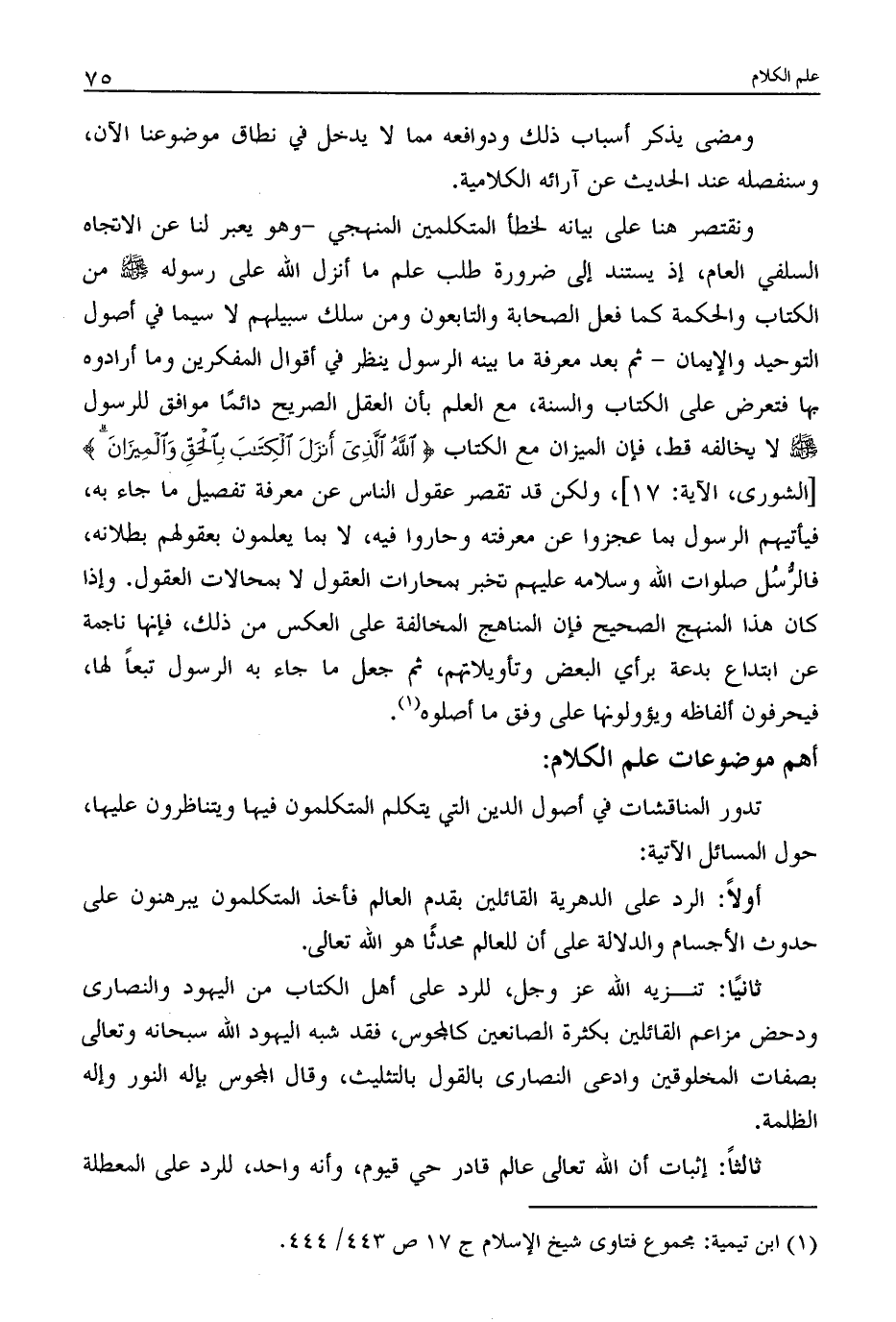 ونقتصر هنا على بيانه لخطأ المتكلمين المنهجي - وهو يعبر لنا عن الاتجاه السلفي العام، إذ يستند إلى ضرورة طلب علم ما أنزل الله على رسوله - صلى الله عليه وسلم - من الكتاب والحكمة كما فعل الصحابة والتابعون ومن سلك سبيلهم لا سيما في أصول التوحيد والإيمان - ثم بعد معرفة ما بينه الرسول ينظر في أقوال المفكرين وما أرادوه بها فتعرض على الكتاب والسنة، مع العلم بأن العقل الصريح دائمًا موافق للرسول - صلى الله عليه وسلم - لا يخالفه قط، فإن الميزان مع الكتاب (اللَّهُ الَّذِي أَنْزَلَ الْكِتَابَ بِالْحَقِّ وَالْمِيزَانَ) [الشورى، الآية: 17] ، ولكن قد تقصر عقول الناس عن معرفة تفصيل ما جاء به، فيأتيهم الرسول بما عجزوا عن معرفته وحاروا فيه، لا بما يعلمون بعقولهم بطلانه، فالرُّسُل صلوات الله وسلامه عليهم تخبر بمحارات العقول لا بمحالات العقول. وإذا كان هذا المنهج الصحيح فإن المناهج المخالفة على العكس من ذلك، فإنها ناجمة عن ابتداع بدعة برأي البعض وتأويلاتهم، ثم جعل ما جاء به الرسول تبعاً لها، فيحرفون ألفاظه ويؤولونها على وفق ما أصلوه (1) .