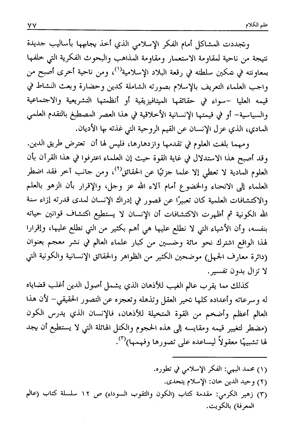 ومهما بلغت العلوم في تقدمها وازدهارها، فليس لها أن تعترض طريق الدين. وقد أصبح هذا الاستدلال في غاية القوة حيث إن العلماء اعترفوا في هذا القرآن بأن العلوم المادية لا تعطي إلا علما جزئيًا عن الحقائق (2) ، ومن جانب آخر فقد اضطر العلماء إلى الانحناء والخضوع أمام آلاء الله عز وجل، والإقرار بأن الزهو بالعلم والاكتشافات العلمية كان تعبيرًا عن قصور في إدراك الإنسان لمدى قدرته إزاء سنة الله الكونية ثم أظهرت الاكتشافات أن الإنسان لا يستطيع اكتشاف قوانين حياته بنفسه، وأن الأشياء التي لا نطلع عليها هي أهم بكثير من التي نطلع عليها، وإقرارا لهذا الواقع اشترك نحو مائة وخمسين من كبار علماء العالم في نشر معجم بعنوان (دائرة معارف الجهل) موضحين الكثير من الظواهر والحقائق الإنسانية والكونية التي لا تزال بدون تفسير.