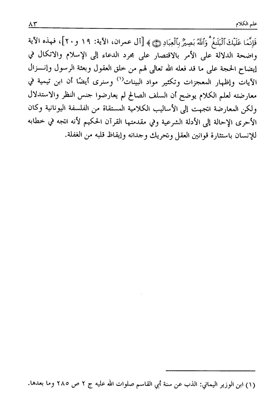 فَإِنَّمَا عَلَيْكَ الْبَلَاغُ وَاللَّهُ بَصِيرٌ بِالْعِبَادِ [آل عمران، الآية: 19 و 20] ، فهذه الآية واضحة الدلالة على الأمر بالاقتصار على مجرد الدعاء إلى الإسلام والاتكال في إيضاح الحجة على ما قد فعله الله تعالى لهم من خلق العقول وبعثة الرسول وإنزال الآيات وإظهار المعجزات وتكثير مواد البينات (1) وسنرى أيضًا أن ابن تيمية في معارضته لعلم الكلام يوضح أن السلف الصالح لم يعارضوا جنس النظر والاستدلال ولكن المعارضة اتجهت إلى الأساليب الكلامية المستقاة من الفلسفة اليونانية وكان الأحرى الإحالة إلى الأدلة الشرعية وفي مقدمتها القرآن الحكيم لأنه اتجه في خطابه للإنسان باستثارة قوانين العقل وتحريك وجدانه وإيقاظ قلبه من الغفلة.