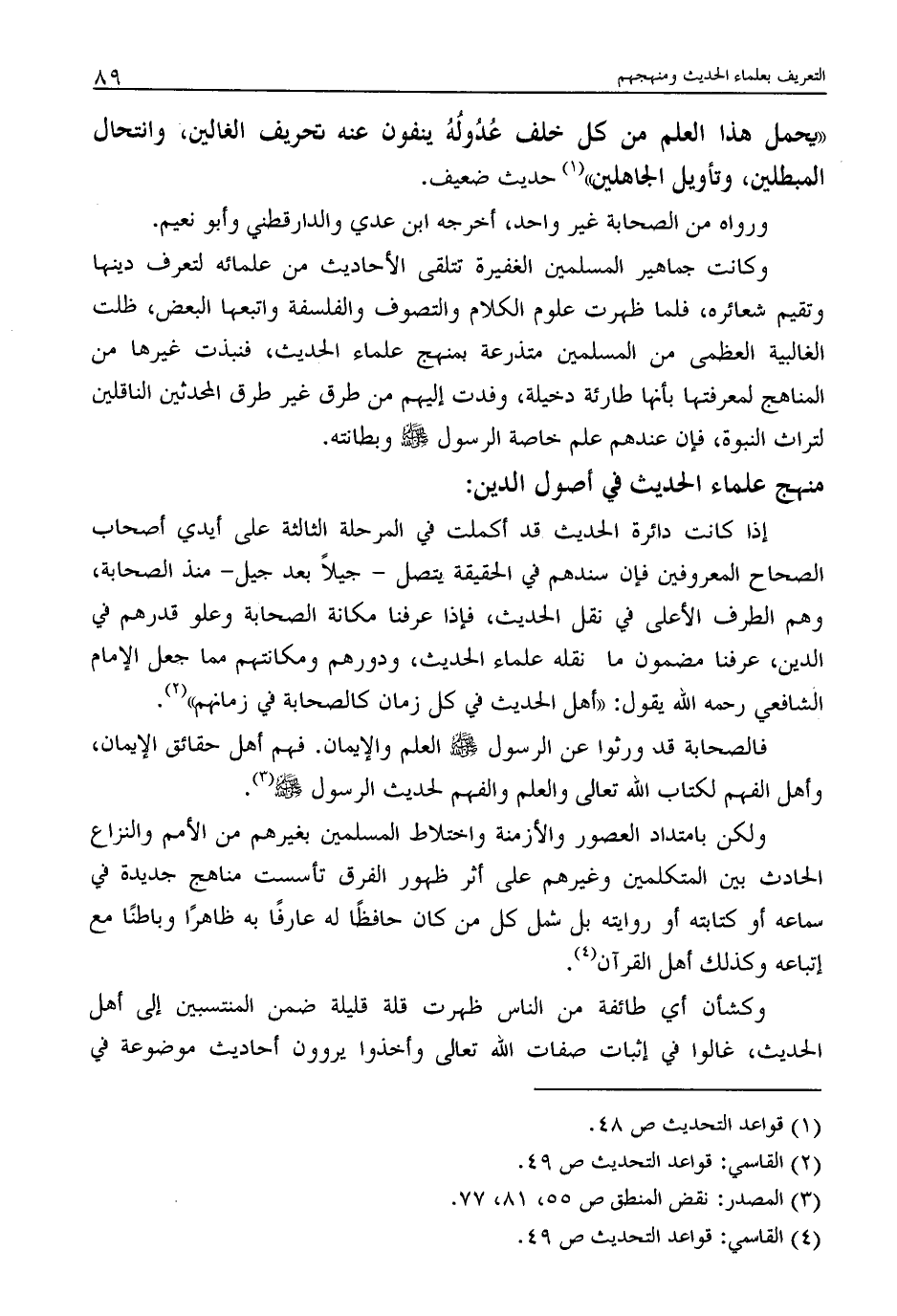 "يحمل هذا العلم من كل خلف عُدُولهُ ينفون عنه تحريف الغالين، وانتحال المبطلين، وتأويل الجاهلين) (1) حديث ضعيف.