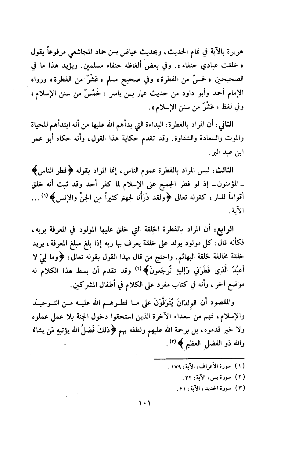 الثالث ـ ليس المراد بالفطرة عموم الناس، وإنما المراد بقوله: فطر الناس: المؤمنون، إذ لو فطر الجميع على الإسلام لما كفر أحد، وقد ثبت أنه خلق أقواماً للنار، كقوله تعالى {ولقد ذرأنا لجهنم كثيراً من الجن والإنس} .