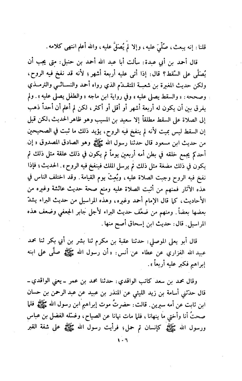قال أحمد بن عبدة: سألت أبا عبد الله أحمد بن حنبل: متى يصلى على السقط؟ قال: إذا أتى عليه أربعة أشهر، لأنه قد نفخ فيه الروح.