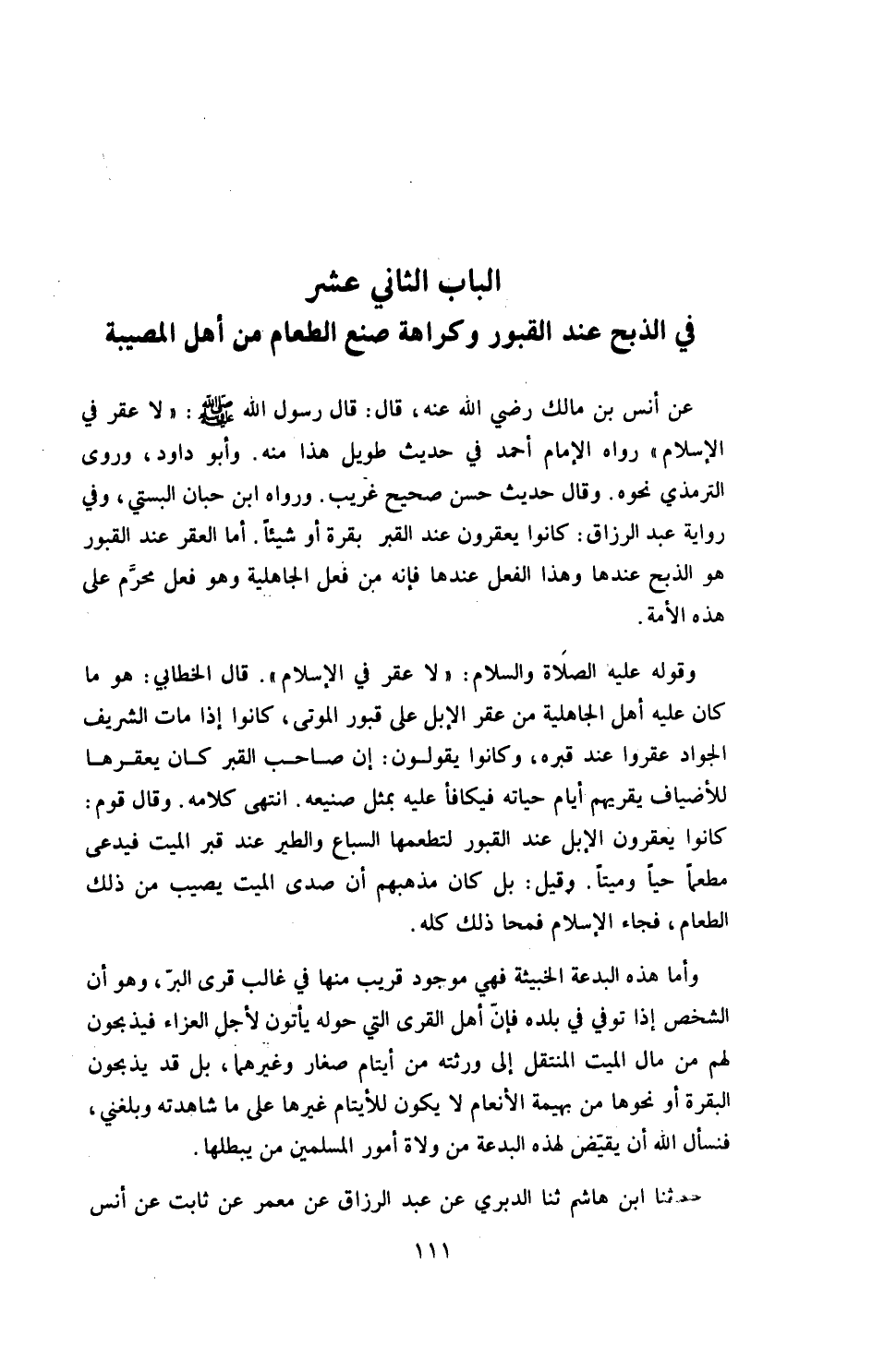 الباب الثاني عشر: في الذبح عند القبور وكراهة صنع الطعام من أهل المصيبة