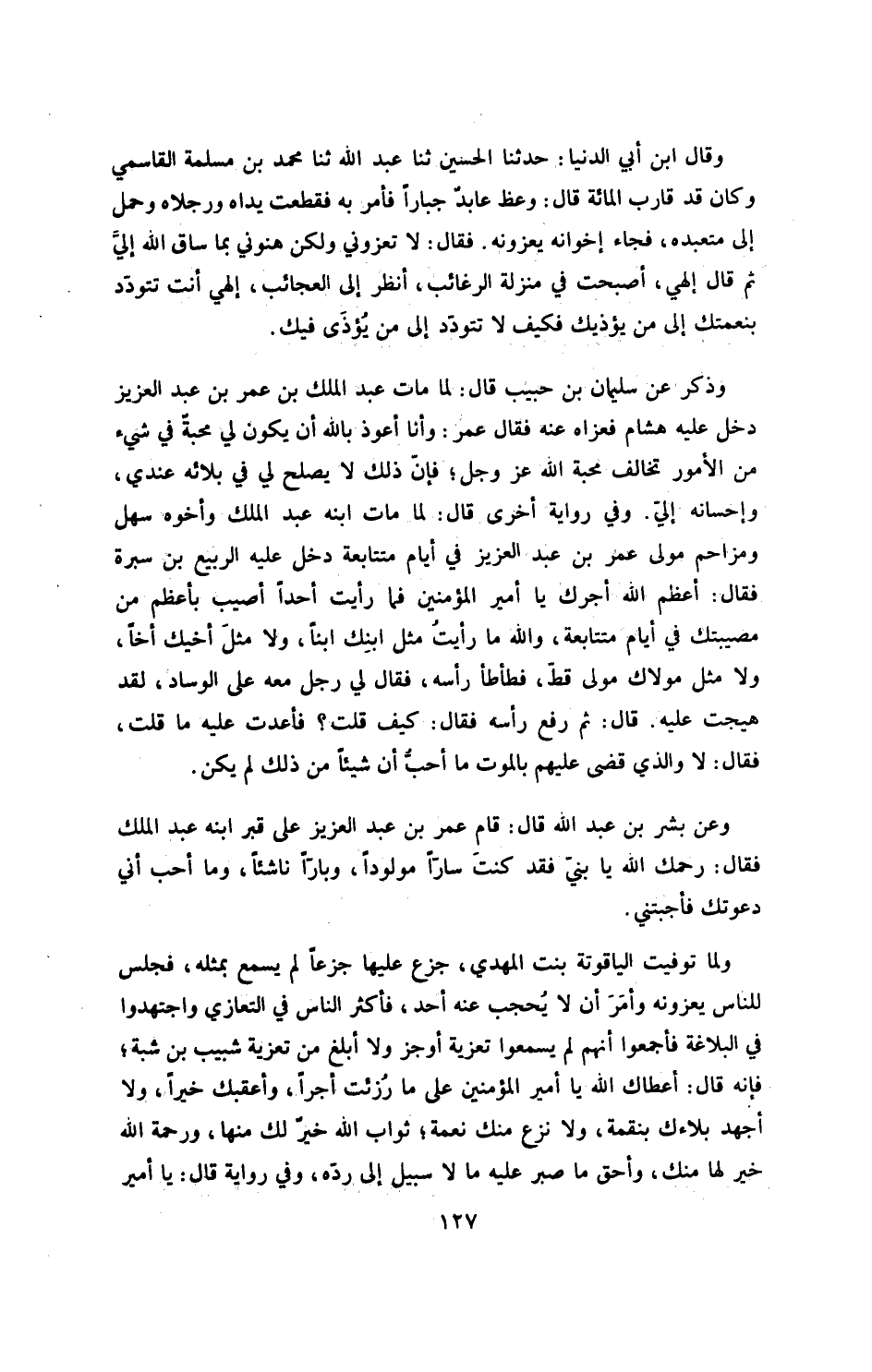 وعن بشر بن عبد الله، قال: قام عمر بن عبد العزيز على قبر ابنه عبد الملك، فقال: رحمك الله يا بني، فقد كنت ساراً مولوداً، وباراً ناشئاً، وما أحب أني دعوتك فأجبتني!