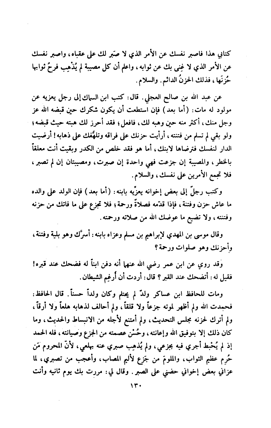 عن عبد الله بن صالح العجلي، قال: كتب ابن السماك إلى رجل يعزيه عن مولود له مات: أما بعد، فإن استطعت أن يكون شكرك حين قبضه الله عز وجل منك، أكثر منه حين وهبه لك، فافعل، فقد أحرز لك هبته حيث قبضه، ولو بقي لم تسلم من فتنته، أرأيت حزنك على فراقه، وتلهفك على ذهابه! أرضيت الدار لنفسك فترضاها لابنك، أما هو فقد خلص من الكدر وبقيت أنت معلقاً بالخطر، والمصيبة إن جزعت، فهي واحدة إن صبرت، ومصيبتان إن لم تصبر، فلا تجمع الأمرين على نفسك، والسلام.