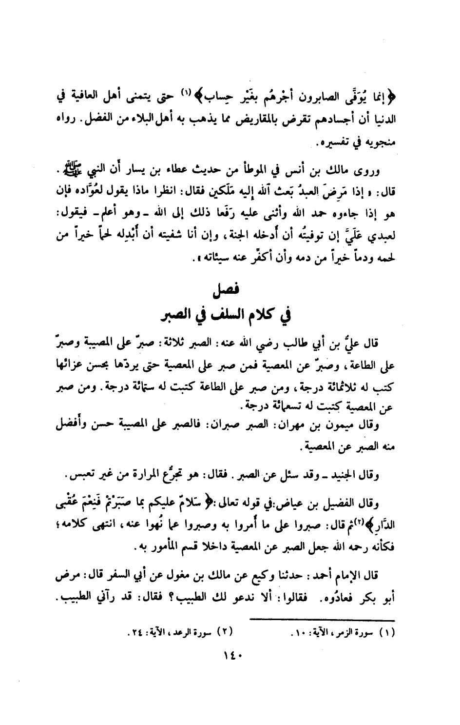 وقال الفضيل بن عياض: في قوله تعالى: {سلام عليكم بما صبرتم فنعم عقبى الدار} ثم قال: صبروا على ما أمروا به، وصبروا عما نهوا عنه.