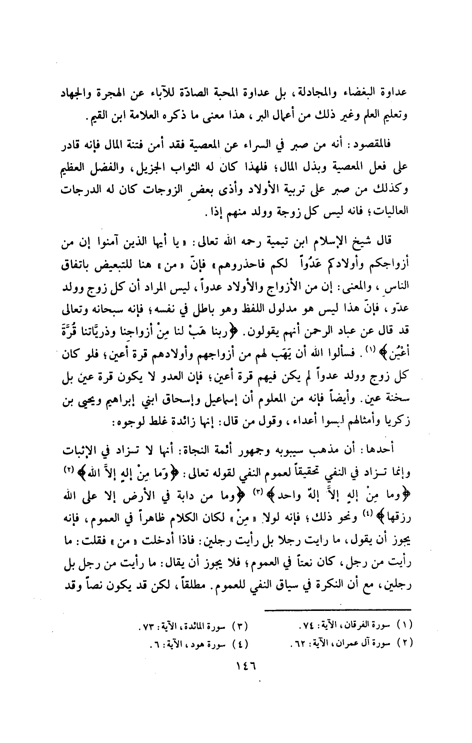 قال شيخ الإسلام ابن تيمية ـ رحمه الله ـ: قال تعالى: {يا أيها الذين آمنوا إن من أزواجكم وأولادكم عدواً لكم فاحذروهم} فإن: من، هنا للتبعيض باتفاق الناس، والمعنى: إن من الأزواج والأولاد عدواً، ليس المراد أن كل زوج وولد عدو، فإن هذا ليس هو مدلول اللفظ، وهو باطل في نفسه، فإنه سبحانه وتعالى قد قال عن عباد الرحمن: إنهم يقولون: {ربنا هب لنا من أزواجنا وذرياتنا قرة أعين} ، فسألوا الله أن يهب لهم من أزواجهم وأولادهم قرة أعين، فلو كان كل زوج وولد عدواً، لم يكن فيهم قرة أعين، فإن العدو لا يكون قرة عين، بل سخنة عين.