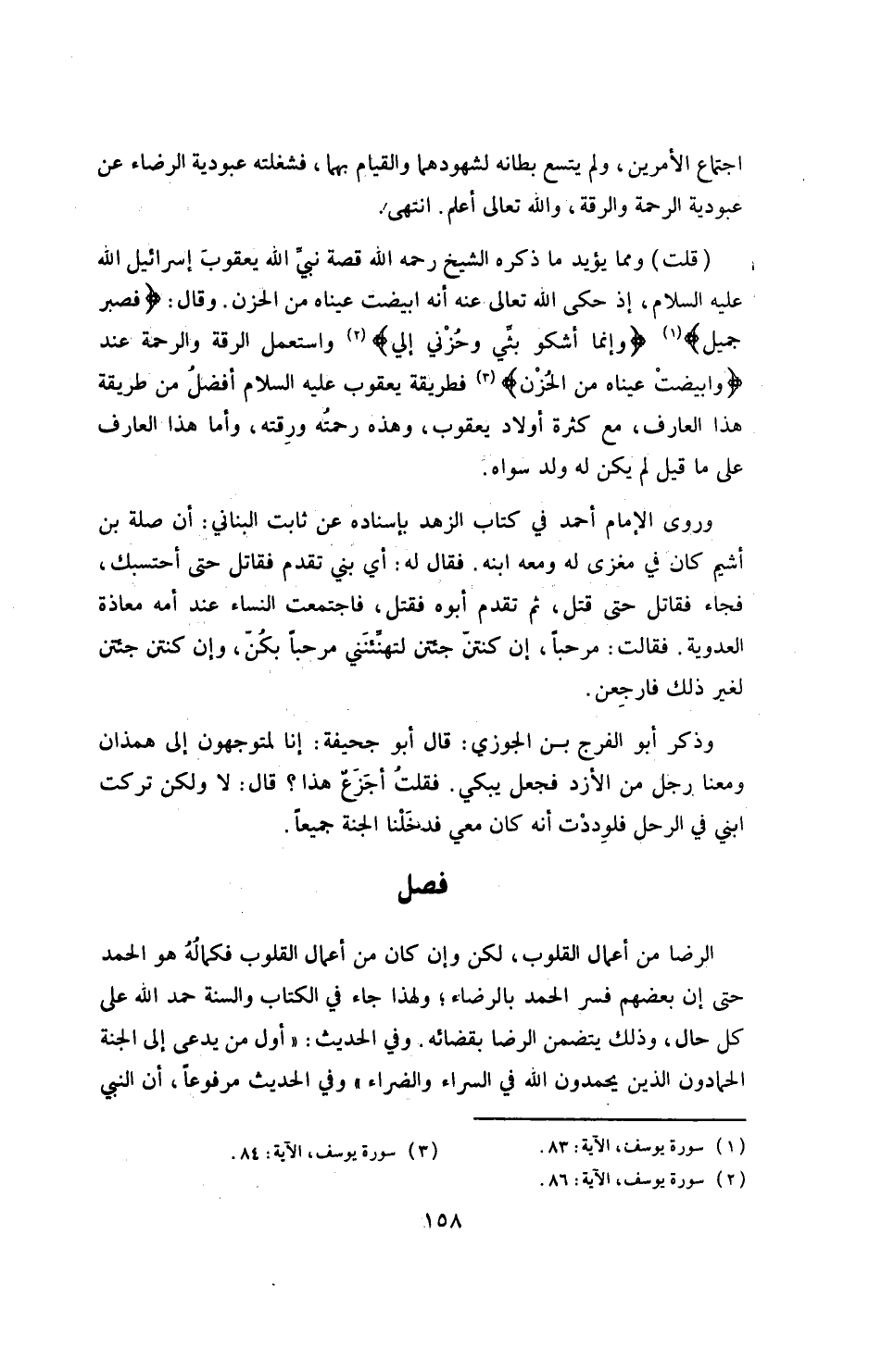 قلت وما يؤيد ما ذكره الشيخ ـ رحمه الله ـ قصة نبي الله يعقوب إسرائيل عليه السلام، إذ حكى الله تعالى عنه أنه ابيضت عيناه من الحزن، وقال: {فصبر جميل} و {إنما أشكو بثي وحزني إلى الله} فمشهده أوسع من مشهد هذا العارف، بل نبي الله يعقوب أبلغ من هذا العارف، فإن يعقوب كان له عدة من الولد، ومع هذا فهذه الرقة والرحمة التي عنده، مع الرضا الكامل، واستعمل الرضا والتفويض في قوله: {إنما أشكو بثي وحزني إلى الله} واستعمل الرقة والرحمة عند {وابيضت عيناه من الحزن} فطريقة يعقوب عليه السلام أفضل من طريقة هذا العارف، مع كثرة أولاد يعقوب، وهذه رحمته ورقته، وأما هذا العارف ـ على ما قيل ـ لم يكن له ولد سواه.