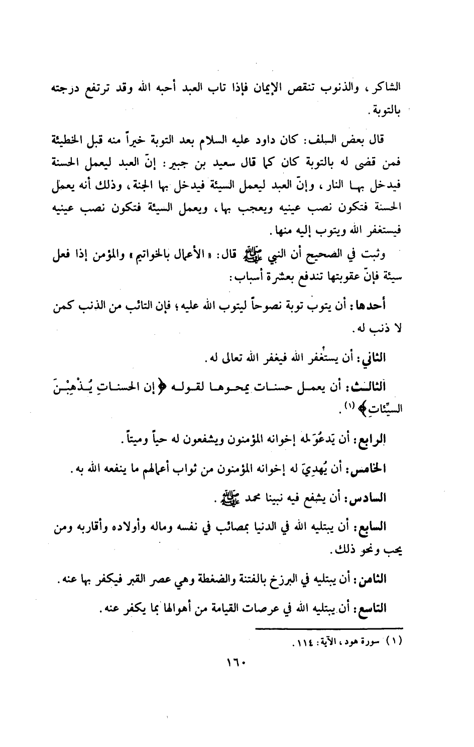 قال بعض السلف: كان داود عليه السلام، بعد التوبة، خيراً منه قبل الخطيئة، فمن قضي له بالتوبة كان كما قال سعيد بن جبير: إن العبد ليعمل الحسنة، فيدخل بها النار، وإن العبد ليعمل السيئة، فيدخل بها الجنة، وذلك أنه يعمل الحسنة، فتكون نصب عينيه ويعجب بها، ويعمل السيئة، فتكون نصب عينيه، فيستغفر الله ويتوب إليه منها.