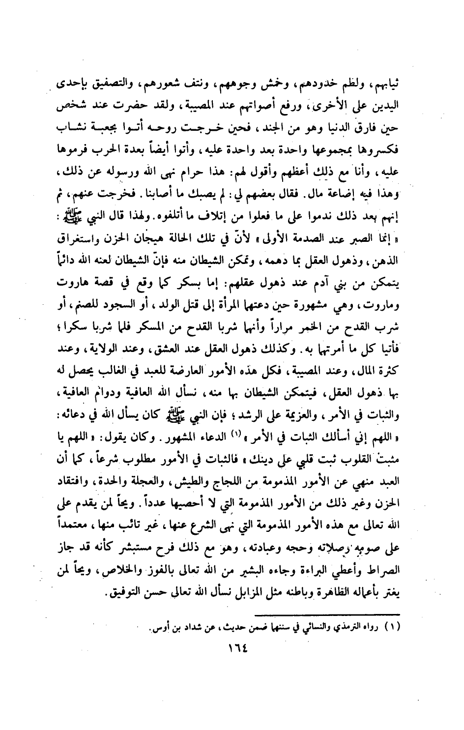 «ولهذا قال النبي صلى الله عليه وسلم: إنما الصبر عند الصدمة الأولى» لأن في تلك الحالة هيجان الحزن، واستغراق الذهن، وذهول العقل بما دهمه، وتمكن الشيطان منه، فإن الشيطان ـ لعنه الله دائماً ـ يتمكن من بني آدم عند ذهول عقلهم: إما بسكر كما وقع في قصة هاروت وماروت، وهي مشهورة حين دعتهما المرأة إل ىقتل الولد، أو السجود للصنم، أو شرب القدح من الخمر مراراً، وأنهما شربا القدح من المسكر، فلما شربا سكرا، فأتيا كل ما أمرتهما به.