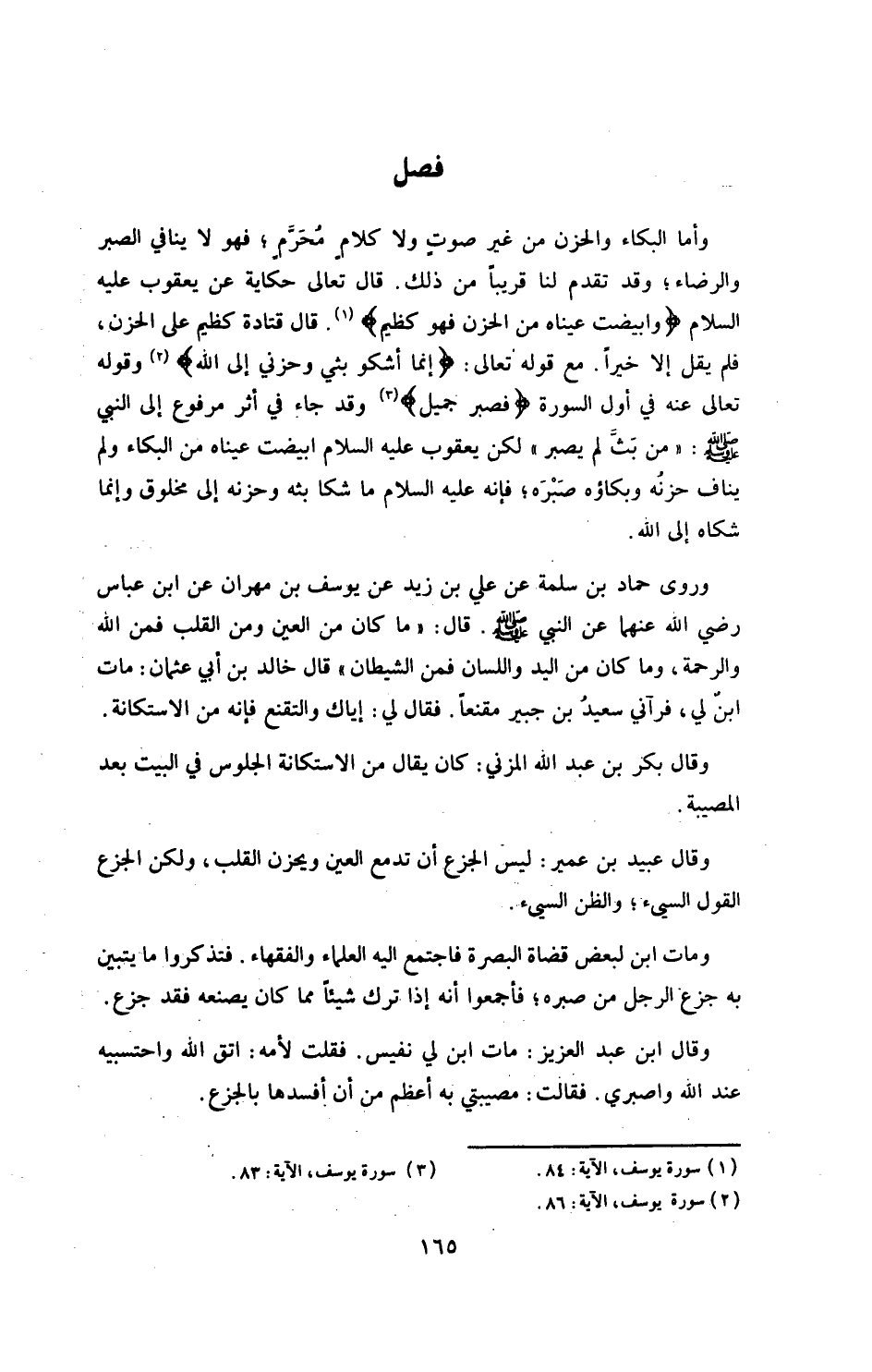 مع قوله تعالى: {إنما أشكو بثي وحزني إلى الله} وقوله تعالى عنه في أول السورة: {فصبر جميل} وقد «جاء في أثر مرفوع إلى النبي صلى الله عليه وسلم: من بث لم يصبر» لكن يعقوب عليه السلام ابيضت عيناه من البكاء، ولم يناف حزنه وبكاءه صبره، فإنه عليه السلام ما شكا بثه وحزنه إلى مخلوق، وإنما شكاه إلى الله.