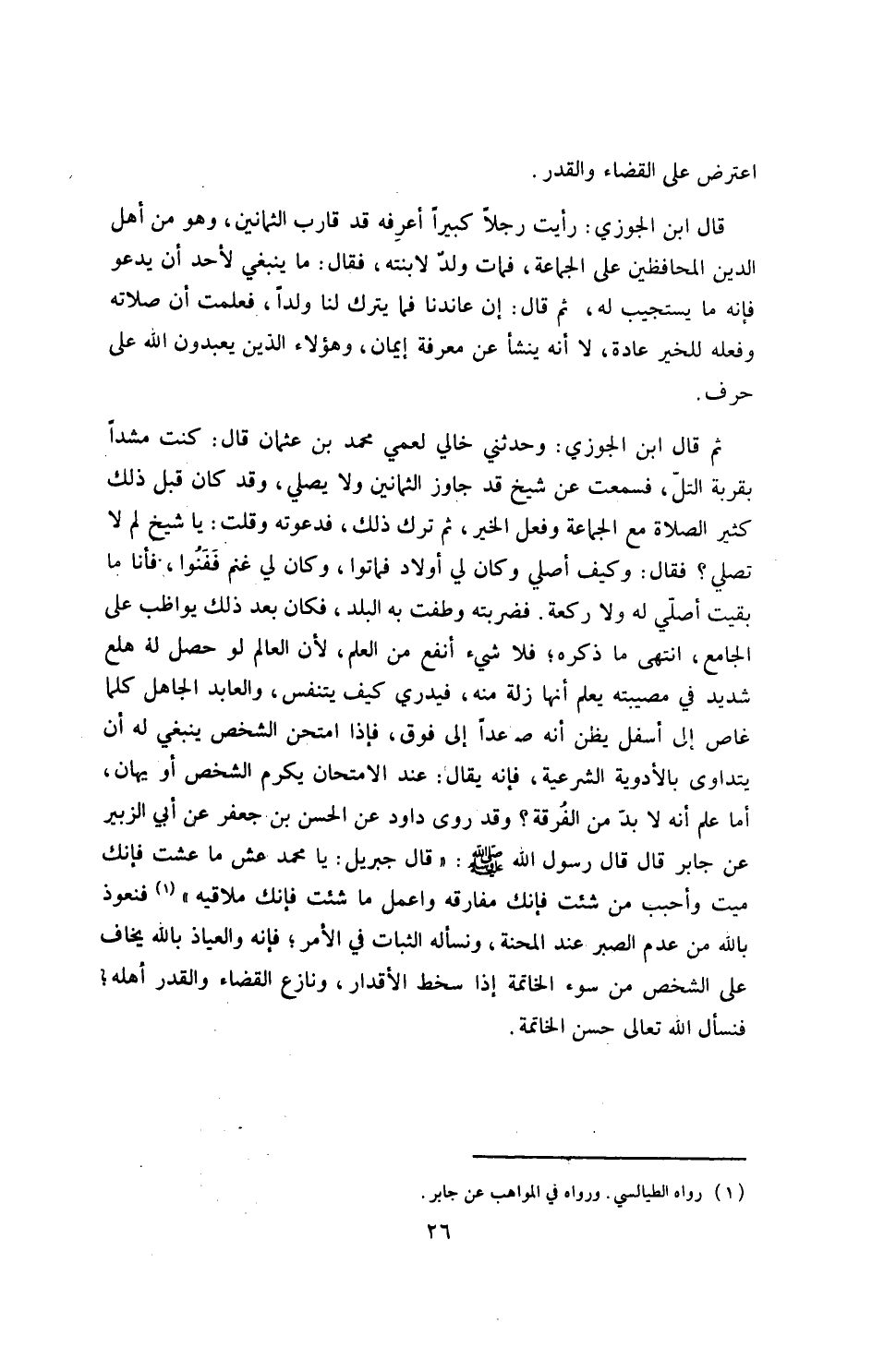 ثم قال ابن الجوزي: حدثني خالي لعمي محمد بن عثمان قال: كنت مشداً بقرية التل، فسمعت عن شيخ قد جاوز الثمانين ولا يصلي، وقد كان قبل ذلك كثير الصلاة مع الجماعة وفعل الخير، ثم ترك ذلك، فدعوته وقلت: يا شيخ، لم لا تصلي؟ فقال: وكيف أصلي، وكان لي أولاد فماتوا، وكان لي غنم ففنيت؟ فأنا ما بقيت أصلي له ولا ركعة، فضربته، وطفت به البلد، فكان بعد ذلك يواظب على الجامع.