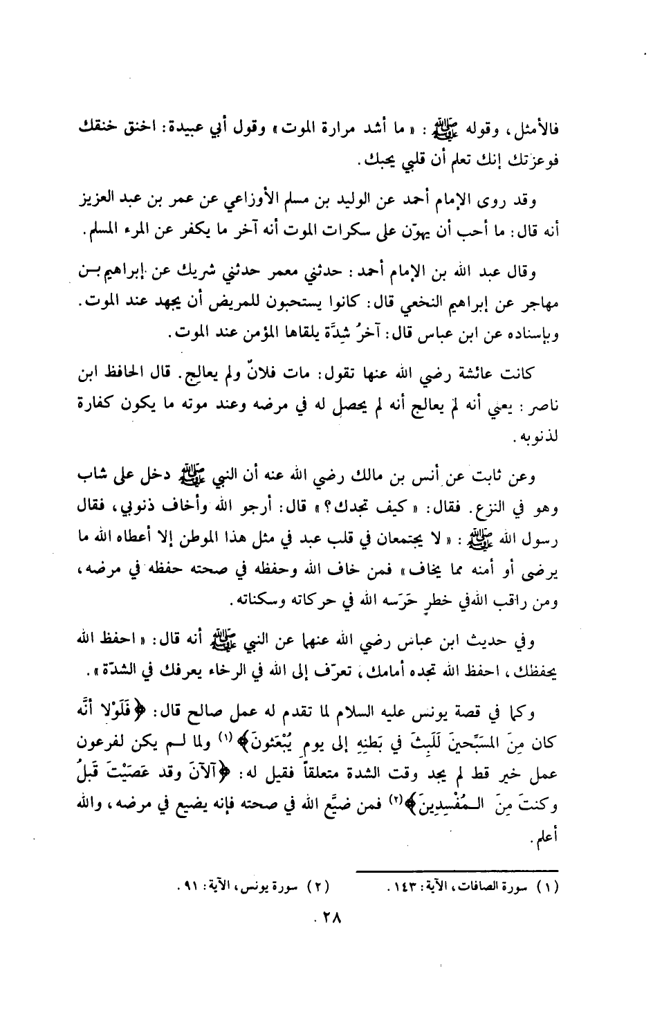 وقد روى الإمام أحمد، عن الوليد بن مسلم الأوزاعي، عن عمر بن عبد العزيز، أنه قال: ما أحب أن يهون علي سكرات الموت إنه آخر ما يكفر عن المرء المسلم.