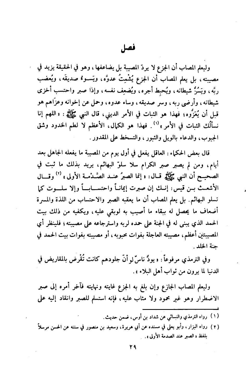بل يعلم المصاب أن ما يعقبه الصبر والاحتساب من اللذة والمسرة أضعاف ما يحصل له ببقاء ما أصيب به لو بقي عليه، بل يكفيه من ذلك بيت الحمد الذي يبنى له في الجنة على حمده لربه واسترجاعه على مصيبته، فلينظر أي المصيبتين أعظم، مصيبته العاجلة بفوات محبوبه، أو مصيبته بفات بيت الحمد في جنة الخلد؟