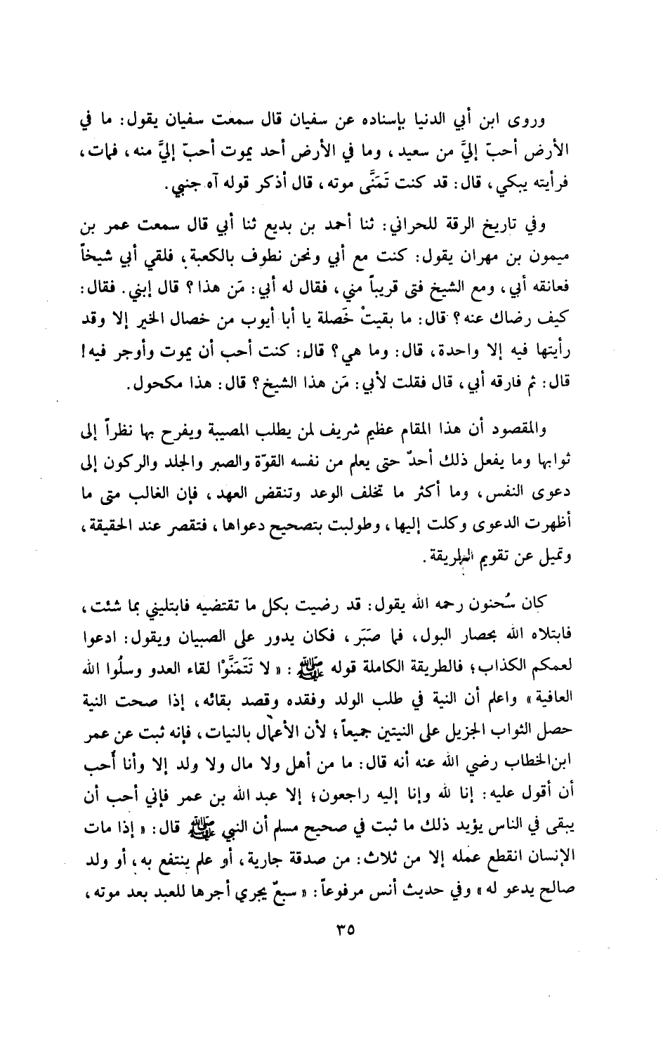 واعلم أن النية في طلب الولد وفقده وقصد بقائه، إذا صحت النية حصل الثواب الجزيل على النيتين جميعاً، لأن الأعمال بالنيات، فإنه ثبت عن عمر بن الخطاب ـ رضي الله عنه ـ أنه قال: ما من أهل ولا مال ولا ولد إلا وأنا أحب أن أقول عليه: {إنا لله وإنا إليه راجعون} ، إلا عبد الله بن عمر فإني أحب أن يبقى في الناس.
