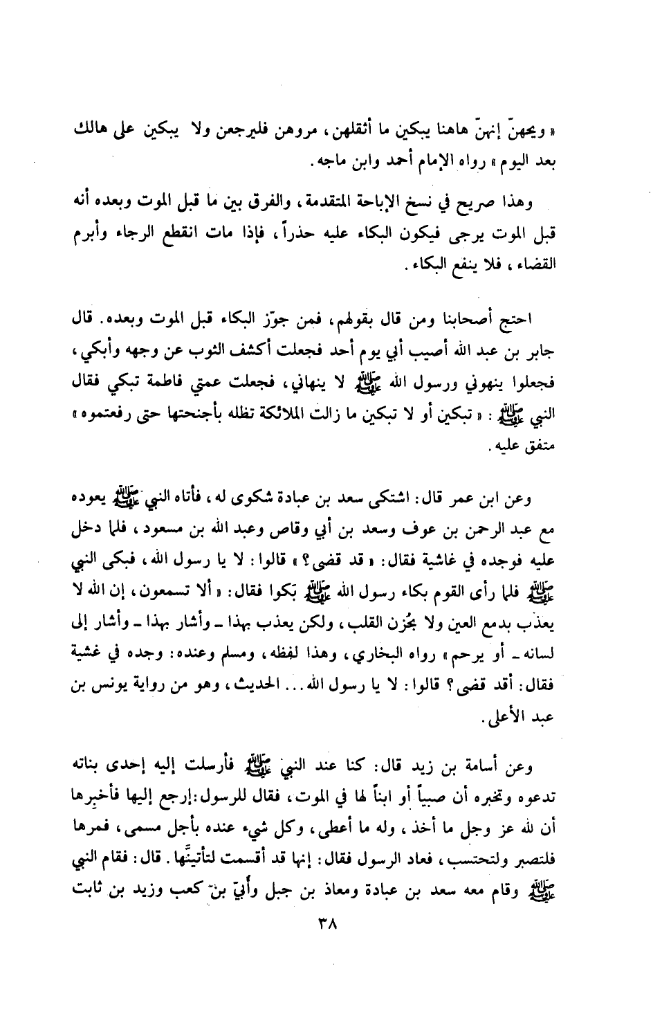 «وعن ابن عمر قال: اشتكى سعد بن عباده شكوى له، فأتاه النبي صلى الله عليه وسلم يعوده مع عبد الرحمن بن عوف وسعد بن أبي وقاص وعبد الله بن مسعود، فلما دخل عليه، فوجده في غاشية، فقال: قد قضى؟ قالوا لا يا رسول الله، فبكى النبي صلى الله عليه وسلم، فلما رأى القوم بكاء رسول الله بكوا، فقال: ألا تسمعون، أن الله لا يعذب بدمع العين ولا بحزن القلب، ولكن يعذب بهذا ـ وأشار إلى لسانه ـ أو يرحم» رواه البخاري، وهذا لفظه، «ومسلم وعنده: وجده في غشية فقال: أقد قضى؟ قالوا: لا يا رسول الله..