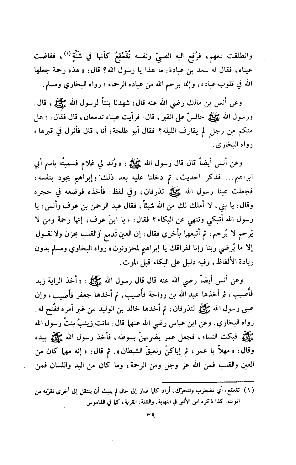 وانطلقت معهم، فرفع إليه الصبي ونفسه تقعقع، كأنها في شنة، ففاضت عيناه، فقال له سعد بن عبادة: ما هذا يا رسول الله؟ قال: هذه رحمة جعلها الله في قلوب عباده، وإنما يرحم الله من عباده الرحماء» رواه البخاري ومسلم.