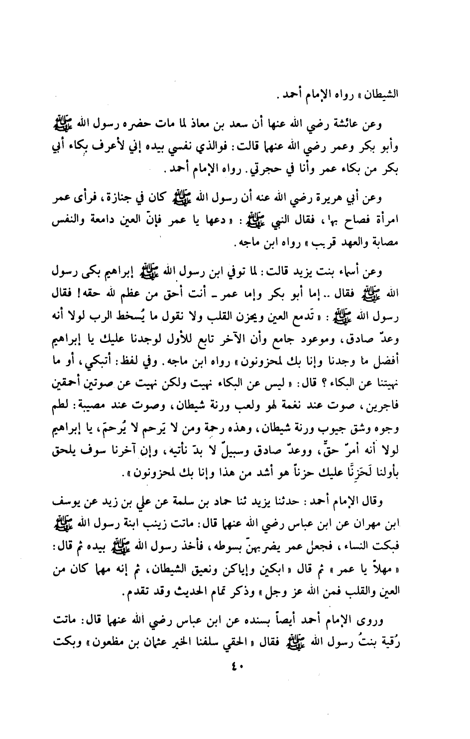 و «عن أسماء بنت يزيد، قالت: لما توفي ابن رسول الله صلى الله عليه وسلم إبراهيم بكي رسول الله صلى الله عليه وسلم، فقال: ـ إما أبو بكر وإما عمر ـ: أنت أحق من عظم لله حقه! فقال رسول الله صلى الله عليه وسلم: تدمع العين، ويحزن القلب، ولا نقول ما يسخط الرب، لولا أنه وعد صادق، وموعد جامع، وأن الآخر تابع للأول، لوجدنا عليك يا إبراهيم أفضل ما وجدنا، وإنا بك لمحزنون» رواه ابن ماجه.
