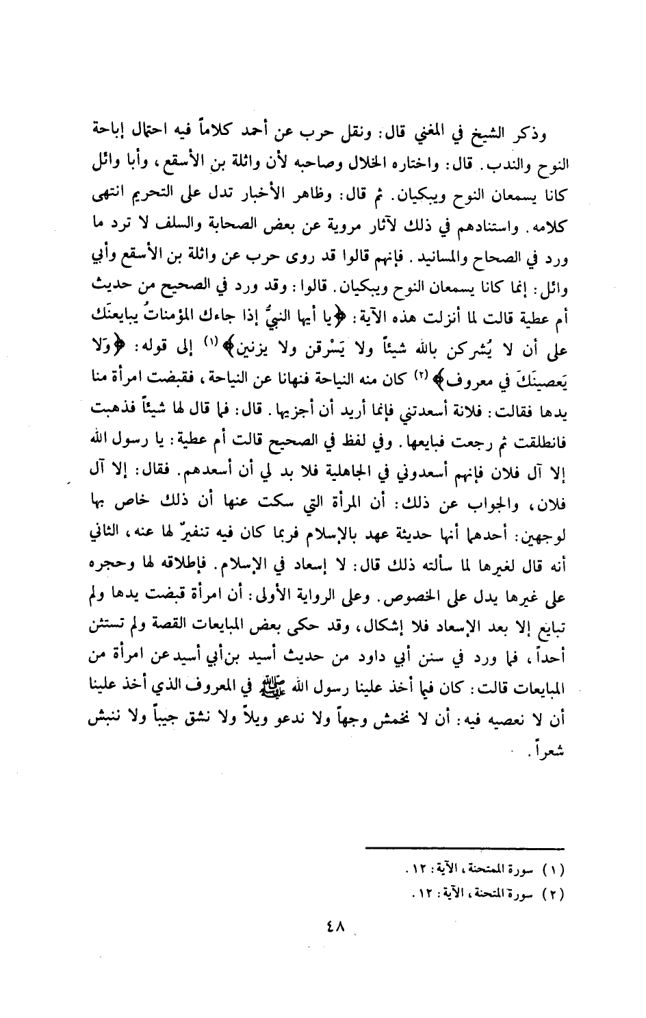 وذكر الشيخ في المغني قال: حرب عن أحمد كلاماً فيه احتمال إباحة النوح والندب، قال: واختاره الخلال وصاحبه، لأن واثلة بن الأسقع، وأبا وائل كانا يسمعان النوح ويبكيان، ثم قال: وظاهر الأخبار تدل على التحريم.
