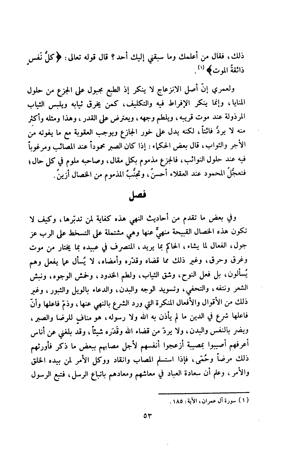 ثم قال: ولعمري، إن أصل الانزعاج لا ينكر، إذ الطبع مجبول على الجزع من حلول المنايا، وإنما ينكر الإفراط فيه والتكليف، كمن يخرق ثيابه ويلبس الثياب المرذولة عند موت قريبه، ويلطم وجهه، ويعترض على القدر، وهذا، ومثله، وأكثر منه، لا يرد فائتاً، لكنه يدل على خور الجازع ويوجب العقوبة، مع ما يفوته من الأجر والثواب.