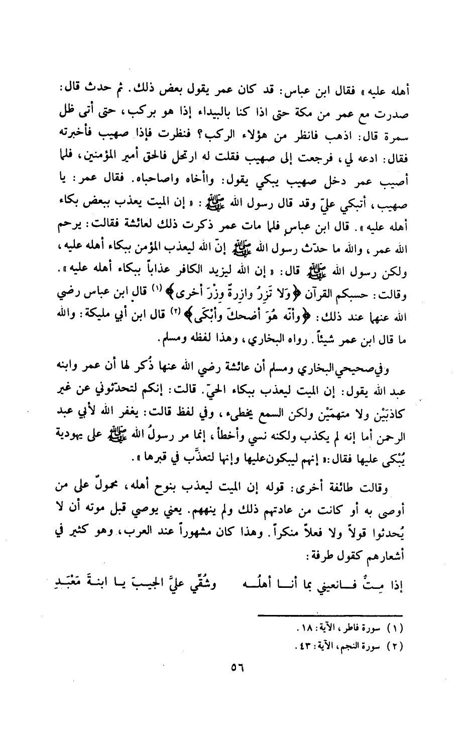 ثم حدث قال: صدرت مع عمر من مكة، حتى إذا كنا بالبيداء إذا هو بركب، حتى إذا ظل سمرة، قال: اذهب فانظر من هؤلاء الركب؟ فنظرت، فإذا صهيب، فأخبرته، فقال: ادعه لي، فرجعت إلى صهيب، فقلت له: ارتحل فالحق أمير المؤمنين، فلما أصيب عمر، دخل صهيب يبكي، يقول: وا أخاه، وا صاحباه، فقال عمر: يا صهيب، أتبكي علي وقد قال رسول الله صلى الله عليه وسلم: إن الميت يعذب ببعض بكاء أهله عليه؟ ! قال ابن عباس: فلما مات عمر، ذكرت ذلك لعائشة، فقالت: يرحم الله عمر، والله ما حدث رسول الله صلى الله عليه وسلم قال: إن الله ليعذب المؤمن ببكاء أهله عليه.