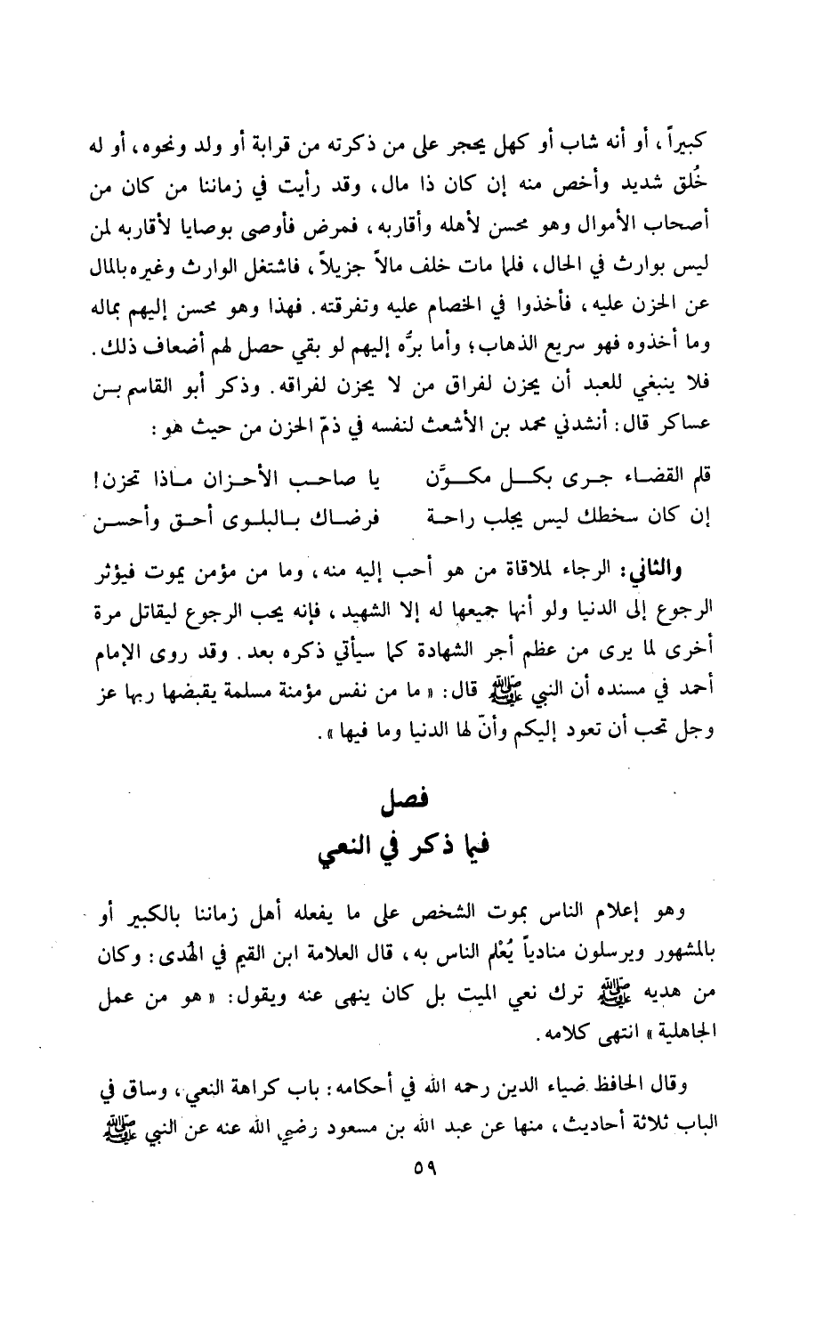 وقال الحافظ ضياء الدين رحمه الله في أحكامه: باب كراهة النعي، وساق في الباب ثلاثة أحاديث، منها: «عن عبد الله بن مسعود ـ رضي الله عنه ـ عن النبي صلى الله عليه وسلم