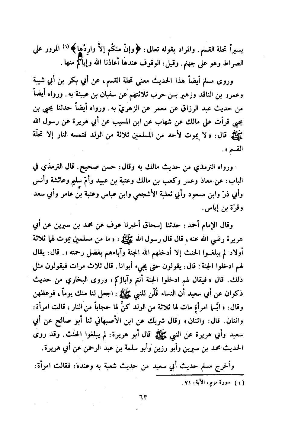 ورواه أيضاً «حدثنا يحيى بن يحيى، قرأت على مالك، عن شهاب، عن ابن المسيب، عن أبي هريرة، عن رسول الله صلى الله عليه وسلم قال: لا يموت لأحد من المسلمين ثلاثة من الولد، فتمسه النار، إلا تحلة القسم» .