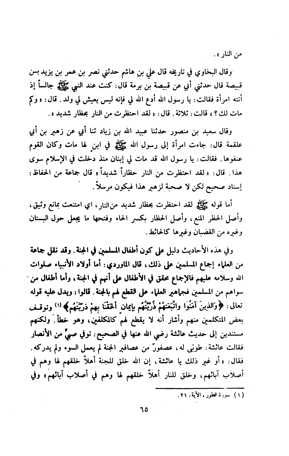 ولكنهم مستندون إلى «حديث عائشة ـ رضي الله عنها ـ في الصحيح: توفي صبي من الأنصار، فقالت عائشة: طوبى له عصفور من عصافير الجنة، لم يعمل السوء ولم يدركه.