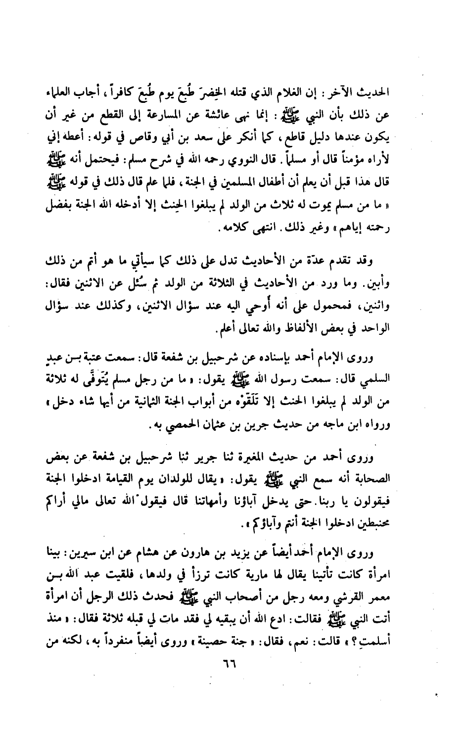 وروى الإمام أحمد أيضاً، «عن يزيد بن هارون، عن هشام، عن ابن سيرين: بينا امرأة كانت تأتينا، يقال لها مارية، كانت ترزأ في ولدها، فلقيت عبد الله بن معمر القرشي، ومعه رجل من أصحاب النبي صلى الله عليه وسلم، فحدث ذلك الرجل أن امراة أتت النبي صلى الله عليه وسلم فقالت: ادع الله أن يبقيه لي، فقد مات لي قبله ثلاثة فقال: مذ أسلمت؟ قالت: نعم، فقال: جنة حصينة» .