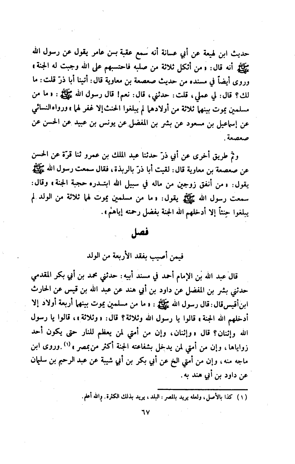 وروى أيضاً في مسنده، «من حديث صعصعة بن معاوية، قال: أتينا أبا ذر، قلت: مالك؟ قال لي عملي، قلت: حدثني، قال: نعم! قال رسول الله صلى الله عليه وسلم: ما من مسلمين يموت بينهما ثلاثة من أولادهما، لم يبلغوا الحنث إلا غفر لهما» .