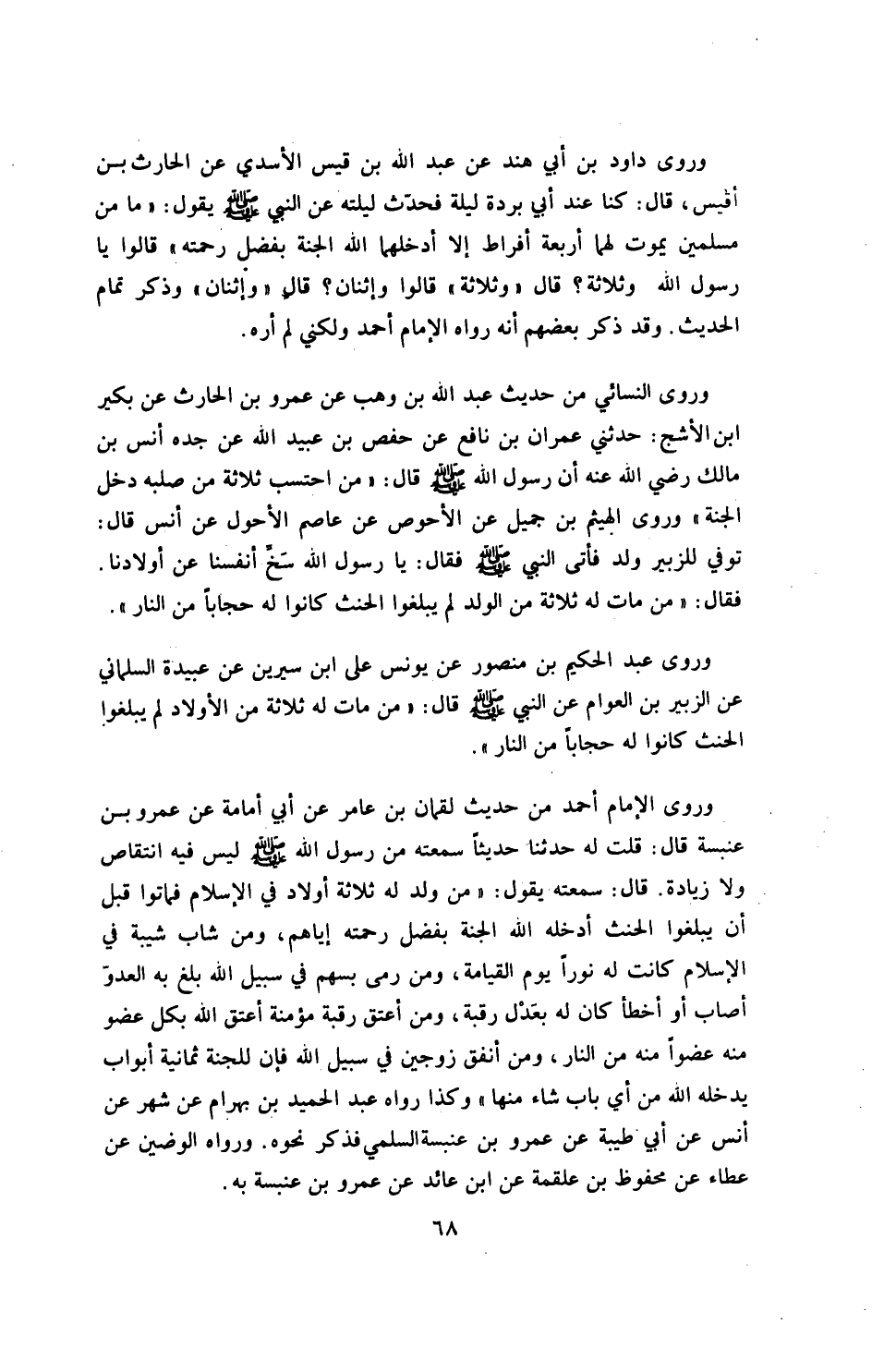 وروى النسائي «من حديث عبد الله بن وهب، عن عمرو بن الحارث، عن بكير بن الأشج، حدثني عمران بن نافع، عن حفص بن عبيد الله عن جده أنس بن مالك ـ رضي الله عنه ـ أن رسول الله صلى الله عليه وسلم قال: من احتسب ثلاثة من صلبه دخل الجنة» .
