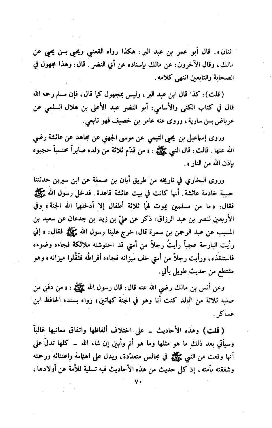 قلت: وهذه الأحاديث ـ على اختلاف ألفاظها واتفاق معانيها غالباً، وسيأتي بعد ذلك ما هو مثلها، وما هو أتم وأبين إن شاء الله ـ كلها تدل على أنها وقعت من النبي صلى الله عليه وسلم في مجالس متعددة، ويدل على اهتمامه واعتنائه ورحمته وشفقته بأمته، إذ كل حديث من هذه الأحاديث، فيه تسلية للأمة عن أولادها،