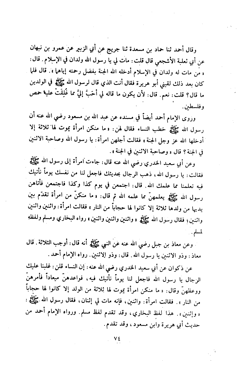 وروى الإمام أحمد أيضاً في مسنده «عن ابن عبد الله بن مسعود ـ رضي الله عنه ـ أن رسول الله صلى الله عليه وسلم خطب النساء، فقال لهن: ما منكن امرأة، يموت لها ثلاثة، إلا أدخلها الله عز وجل الجنة، فقالت: أجلهن امرأة يا رسول الله وصاحبة الاثنين في الجنة؟ قال: وصاحبة الاثنين في الجنة» .