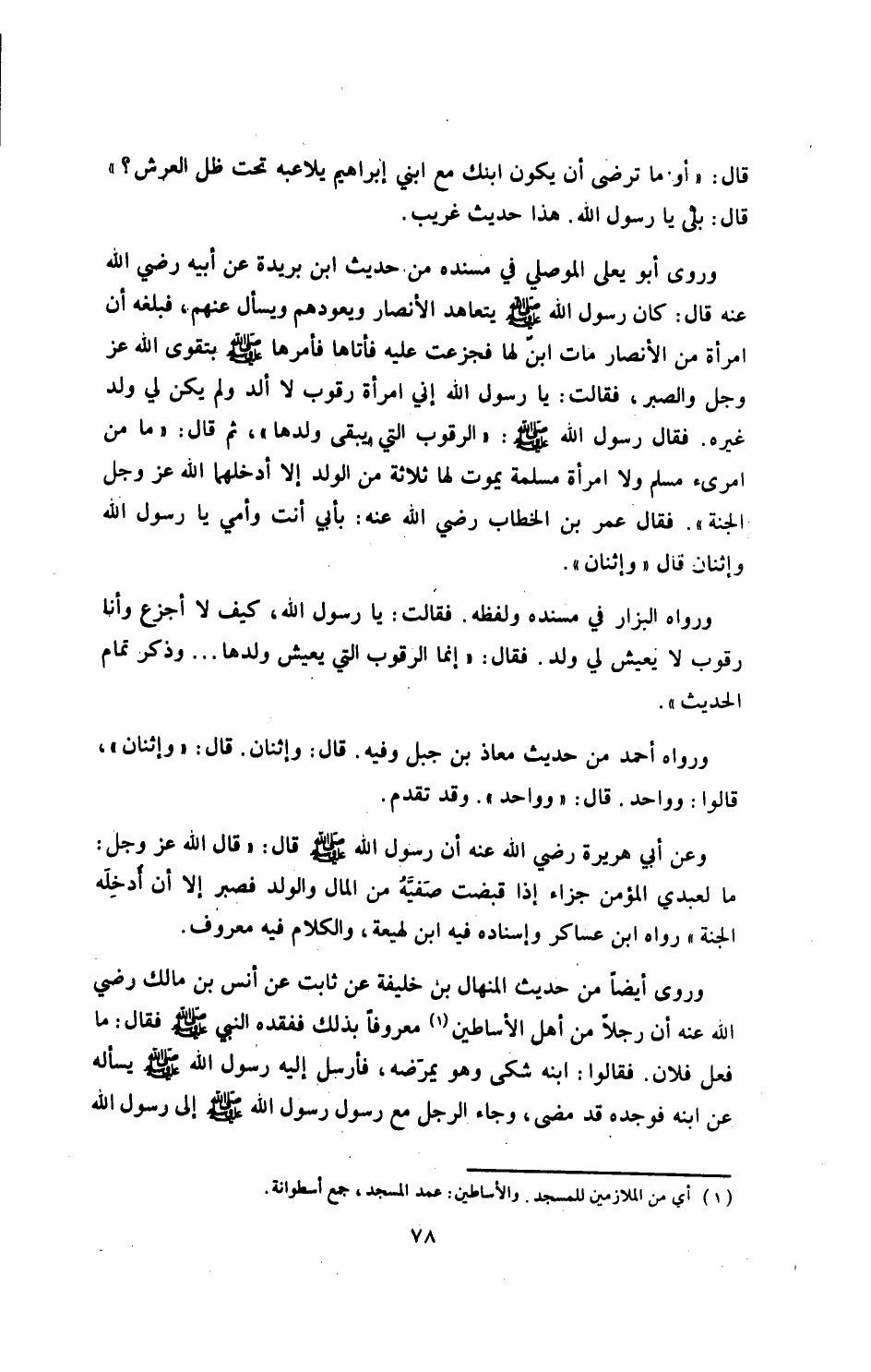 وروى أبو يعلى الموصلي في مسنده «من حديث ابن بريدة، عن أبيه ـ رضي الله عنه ـ قال: كان رسول الله صلى الله عليه وسلم يتعاهد الأنصار، ويعودهم، ويسأل عنهم، فبلغه أن امرأة من الأنصار مات ابن لها، فجزعت عليه، فأتاها، فأمرها صلى الله عليه وسلم بتقوى الله عز وجل والصبر، فقالت: يا رسول الله، إني امرأة رقوب لا ألد، ولم يكن لي ولد غيره، فقال رسول الله صلى الله عليه وسلم: الرقوب التي يبقى ولدها، ثم قال: ما من امرئ مسلم، ولا امرأة مسلمة، يموت لها ثلاثة من الولد، إلا أدخلهما الله عز وجل الجنة، فقال عمر بن الخطاب ـ رضي الله عنه ـ: بأبي أنت وأمي يا رسول الله، واثنان؟ قال: واثنان» .